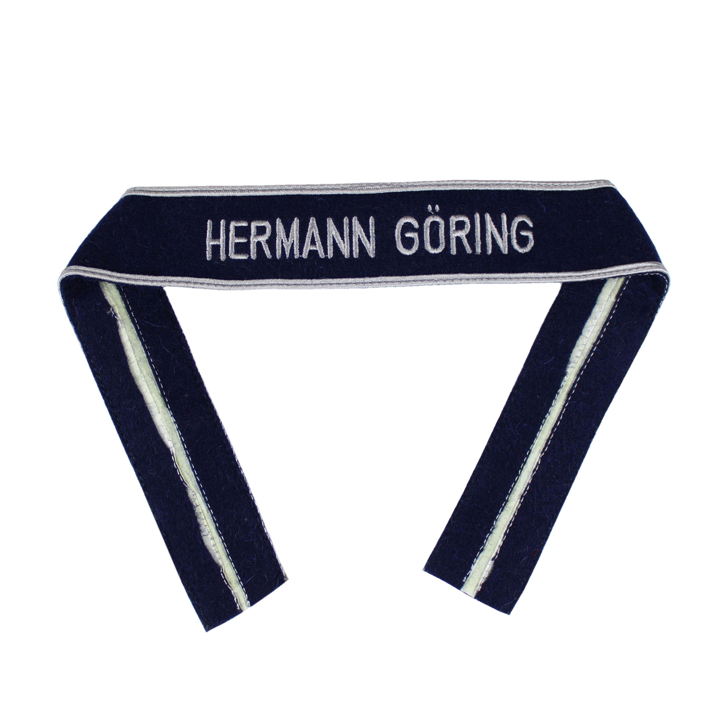 Doskonała replika taśmy na rękaw "Hermann Goering" w wersji podoficerskiej. Taśma wykonana jest metodą haftu maszynowego srebrno-szarą nicią na granatowej podkładce sukiennej.
