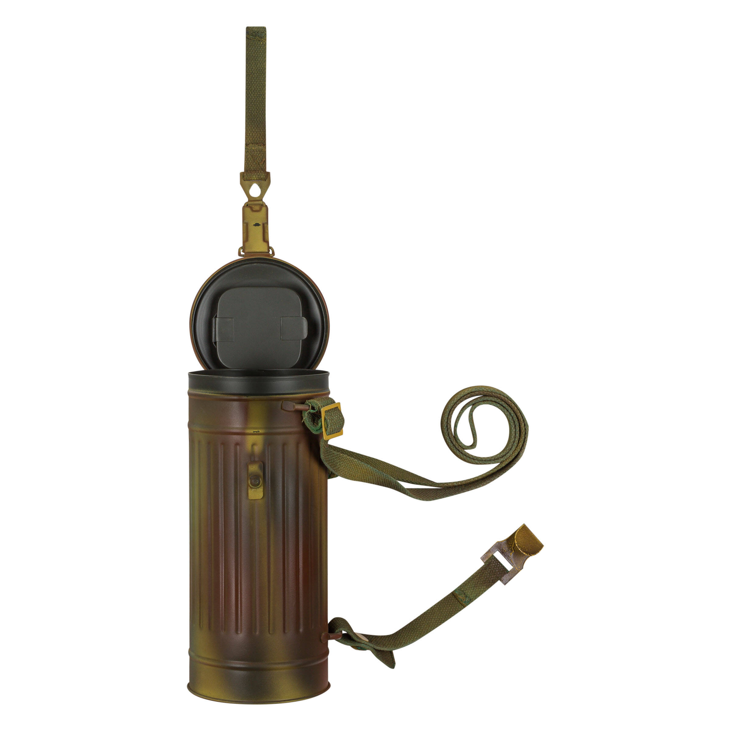Replika puszki na maskę przeciwgazową wraz z paskami. Puszka w wersji dla WH i SS w malowaniu kamuflażu tzw. normandzkim - farba piaskowa zmieszana z zieloną. Wykonana z blachy, identycznie jak oryginał. Paski są parciane, barwione na kolor zielony z hakami metalowymi. Sygnowana na pojemniku na zapasowe szkła, pojemnik oczywiście otwierany - wewnątrz znajduje się sprężyna przytrzymująca. Cena obejmuje puszkę wraz z paskami i hakami - w zestawie nie znajduje się maska ani żaden inny element wyposażenia maski. Standardowa wersja puszki jest również dostępna w naszej ofercie!