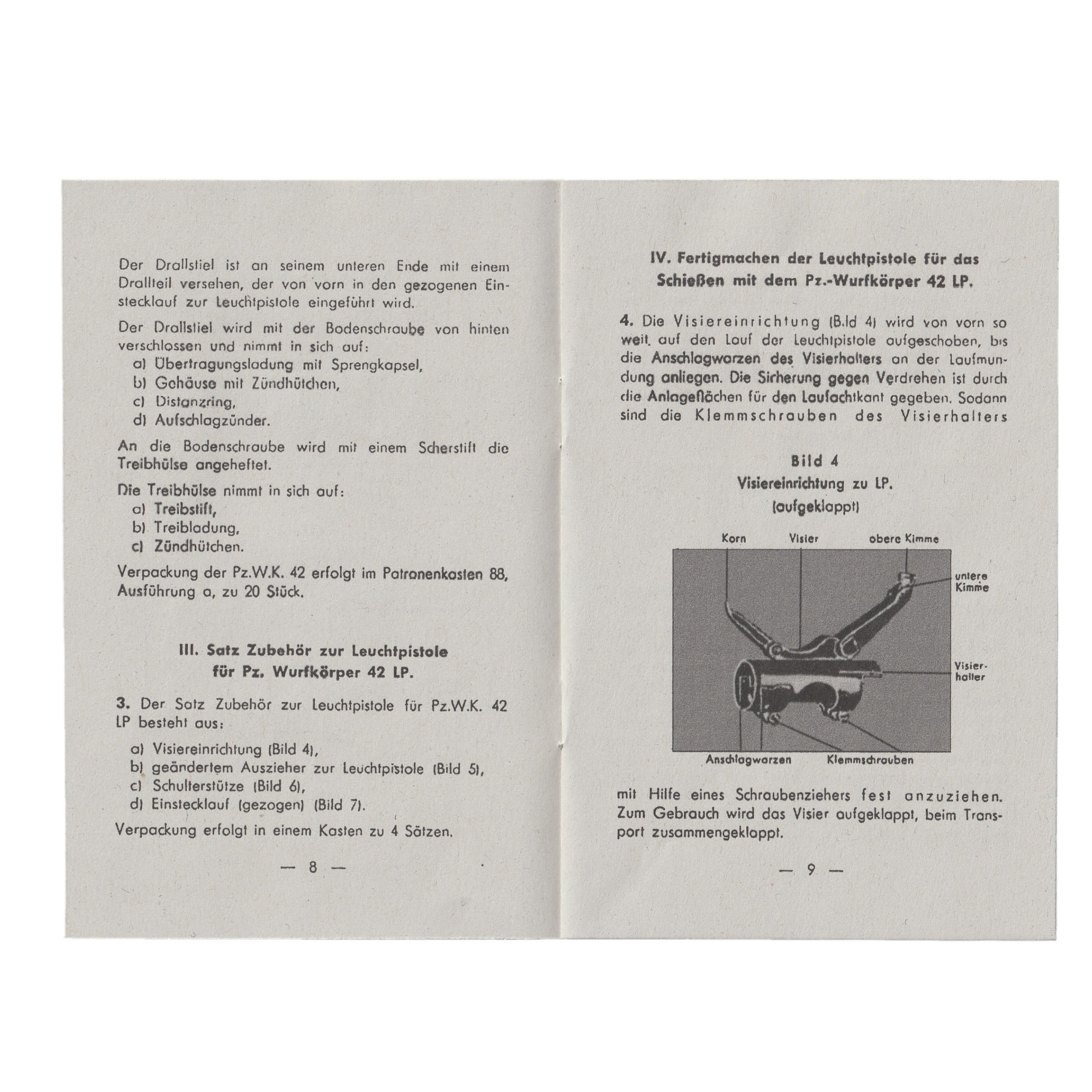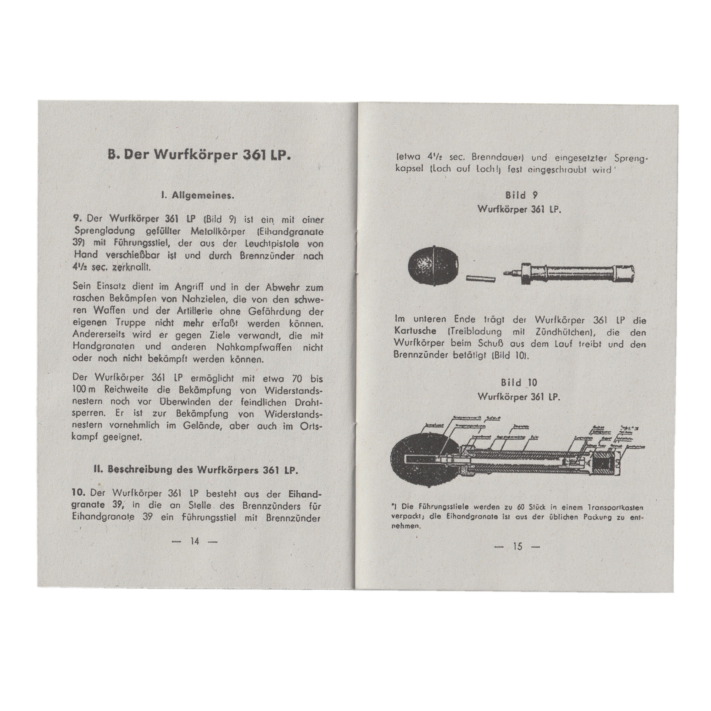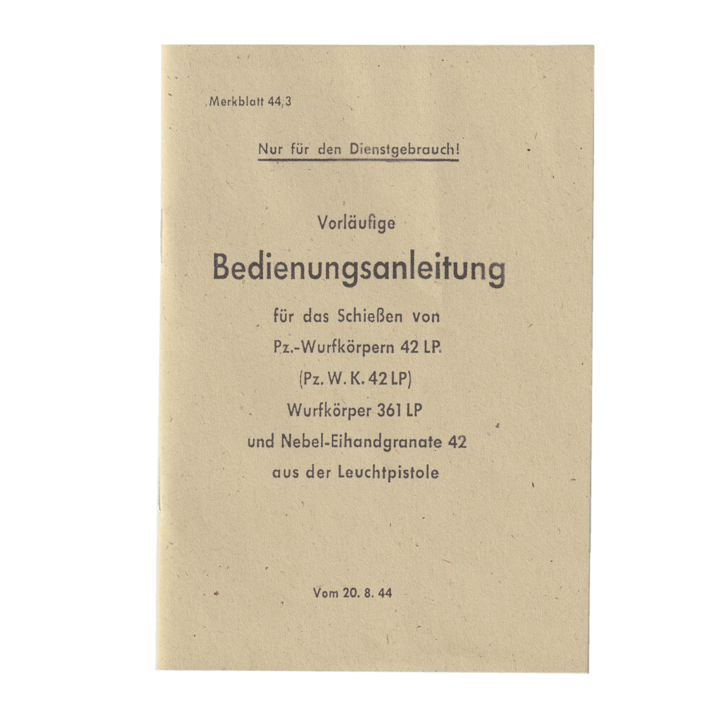 Doskonała replika Bedienungsanleitung, czyli książeczki instruktażowej do granatów (Pz.-Wurfkorpern 42 LP, Wurfkorper 361 LP, Nebel-Eihandgranate 42) przeznaczonych do wystrzeliwania z pistoletu sygnałowego (Leuchtpistole 34/42). Książeczka składa się zarówno z opisów obsługi jak i rysunków technicznych broni i granatów. Replika jest wykonana na solidnym papierze. Bardzo wiernie odwzorowano szczegóły.
