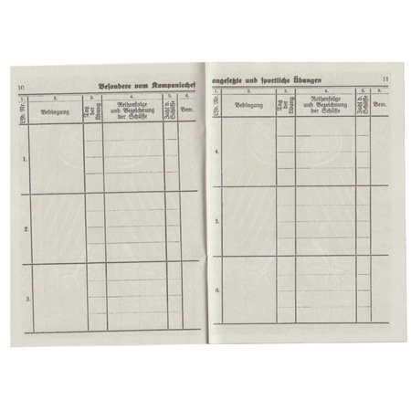 Doskonała replika książeczki do zapisu wyników strzelań członka Służby Pracy Rzeszy - Reichsarbeitsdienst. Była to paramilitarna formacja III Rzeszy założona w roku 1935. Książeczka dotyczyła strzelań z Gewehr 98. Schiessbuch jest wykonany na solidnym papierze, w środku pusty. Bardzo wiernie odwzorowane szczegóły.