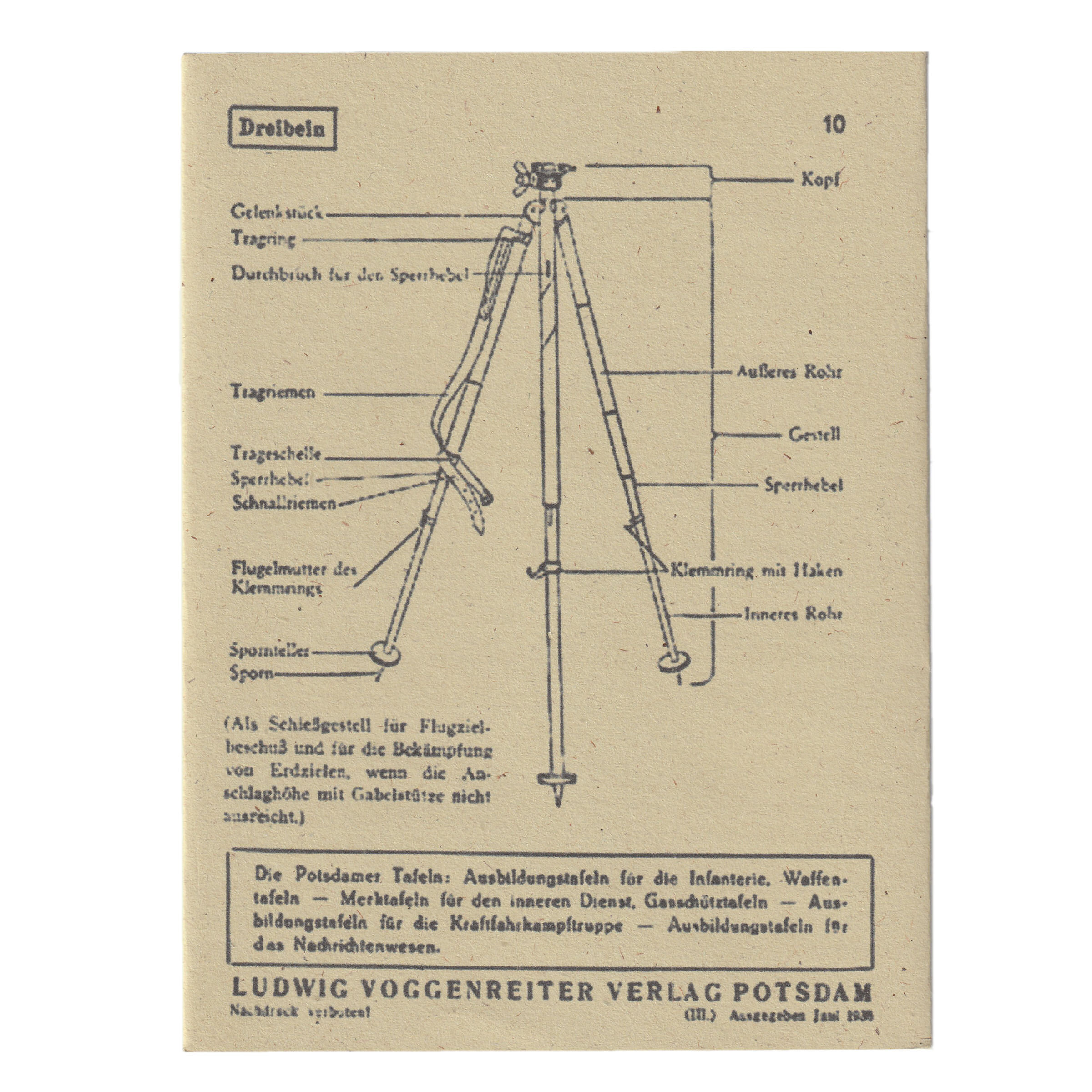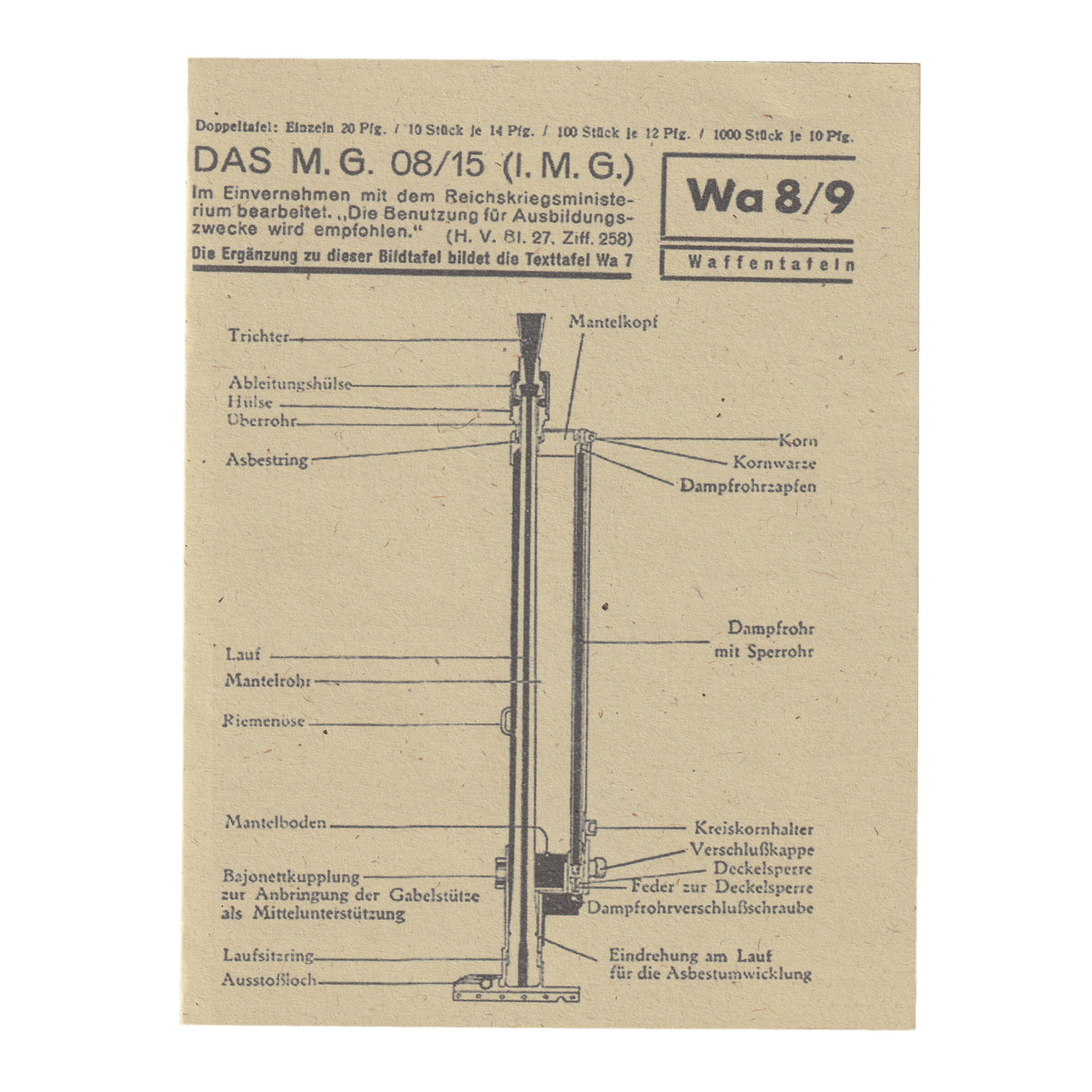 Doskonała replika Waffentafeln Das Maschinengewehr 08/15 czyli tablicy z najistotniejszymi informacjami o karabinie maszynowym MG 08/15. Był to jeden z podstawowych niemieckich karabinów maszynowych podczas I wojny światowej. Sporadycznie używany jeszcze w okresie II wojny światowej (głównie jako broń forteczna). Waffentafeln składa się zarówno z opisów jak i rysunków technicznych broni. Replika jest wykonana na solidnym papierze. Bardzo wiernie odwzorowano szczegóły. Jest to reprint broszury wydanej dla Heer w latach 30tych, 20go wieku.