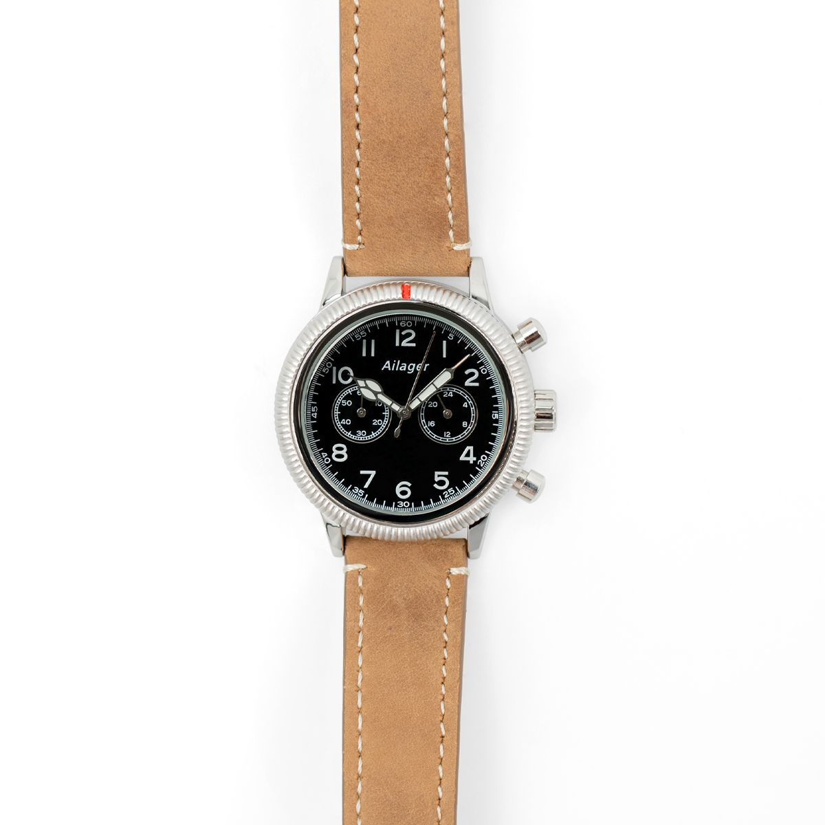 Replika niemieckiego wojskowego (dla pilotów Luftwaffe) zegarka służbowego opartego na modelu z 1939 roku, wyprodukowany przez renomowaną markę Ailager®. Każdy zegarek ma brązowy, 25-centymetrowy, pasek na nadgarstek wykonany z naturalnej skóry, zakończony z jednej strony tradycyjną srebrną metalową klamrą. Tarcza zegarka jest umieszczona w srebrnej obudowie ze stali nierdzewnej. Z tyłu tarczy znajduje wytłoczenie „Wasserdicht Stahlboden”, co oznacza „wodoodporna stalowa podstawa”. Na zewnętrznej stronie tarczy, antypoślizgowy bezel umożliwia odliczanie czasu w górę i w dół za pomocą pojedynczej, wyrazistej czerwonej kreski. Na tarczy główny czas wskazywany jest przez centralnie umieszczone wskazówki minutową i godzinową w klasycznym stylu, co zapewnia maksymalne podświetlenie, uzupełnione o 24-godzinny czas na prawej subtarczy. W tym miejscu Ailager odszedł od oryginałów, podejmując decyzję o zastosowaniu nowoczesnych mechanizmów i zastąpieniu oryginalnej 30-minutowej tarczy tarczą 24-godzinną, bardziej funkcjonalną opcją do noszenia na co dzień. Funkcje chronografu są kontrolowane za pomocą przycisków – górnego do stop/start, a dolnego do resetowania stopera, powrotu centralnej wskazówki sekundowej i lewej subtarczy minutowej.