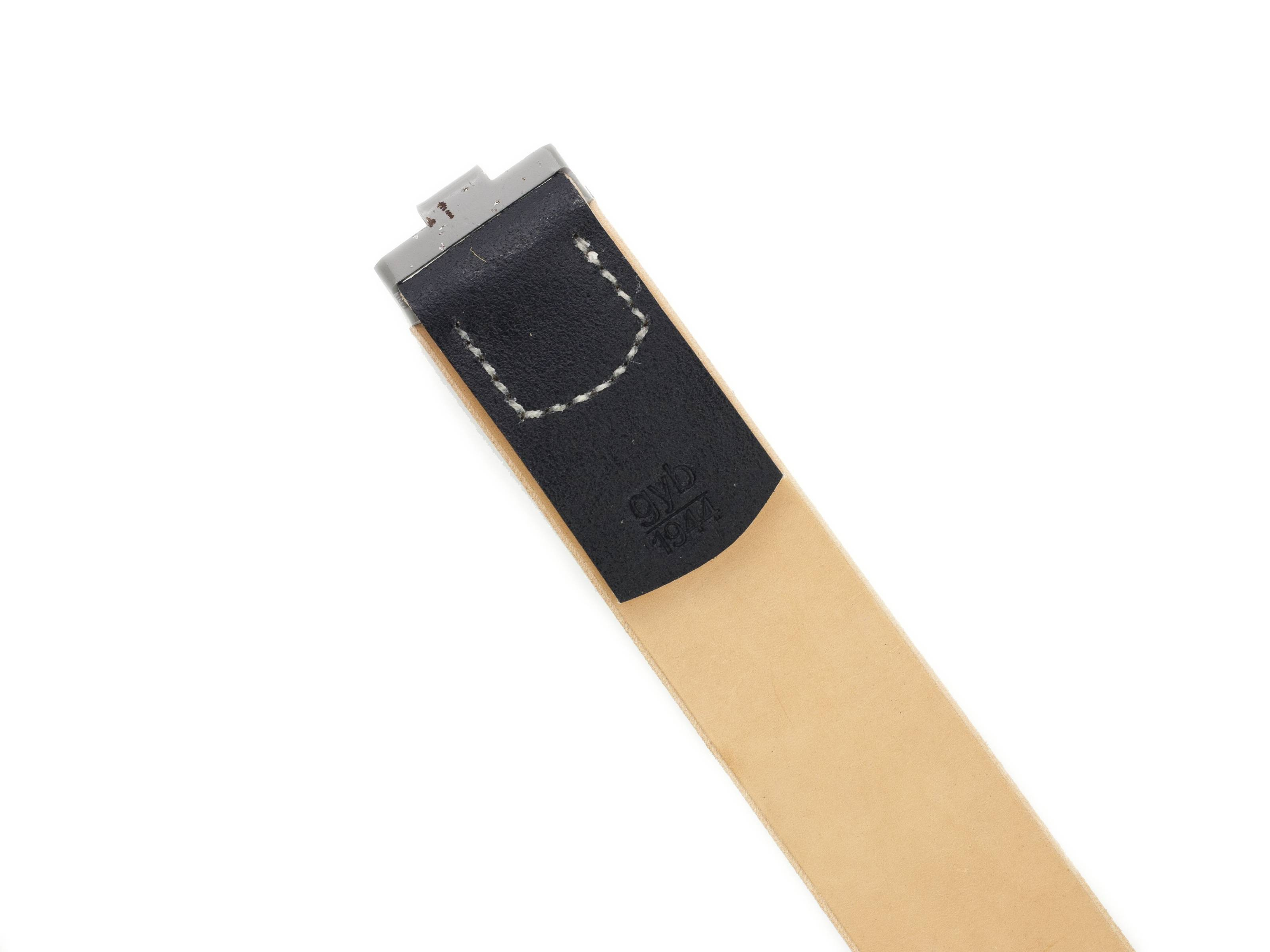 Replika niemieckiego pasa głównego w wersji późno wojennej M44. Pas wykonany z naturalnej skóry gładką stroną na zewnątrz. Wersja bez paska regulacyjnego. Malowany na czarno. Powierzchnia zabezpieczona przed strzępieniem. Hak wykonany ze stali.