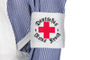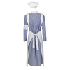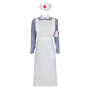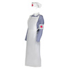 Replika zestawu ubioru niemieckiej sanitariuszki DRK. Umundurowanie wykonane z bawełny, zestaw składa się z następujących elementów: sukienka w niebiesko-białe paski, czepek na głowę, fartuch oraz opaska DRK. Fartuch, czepek i opaska mają rozmiar uniwersalny.