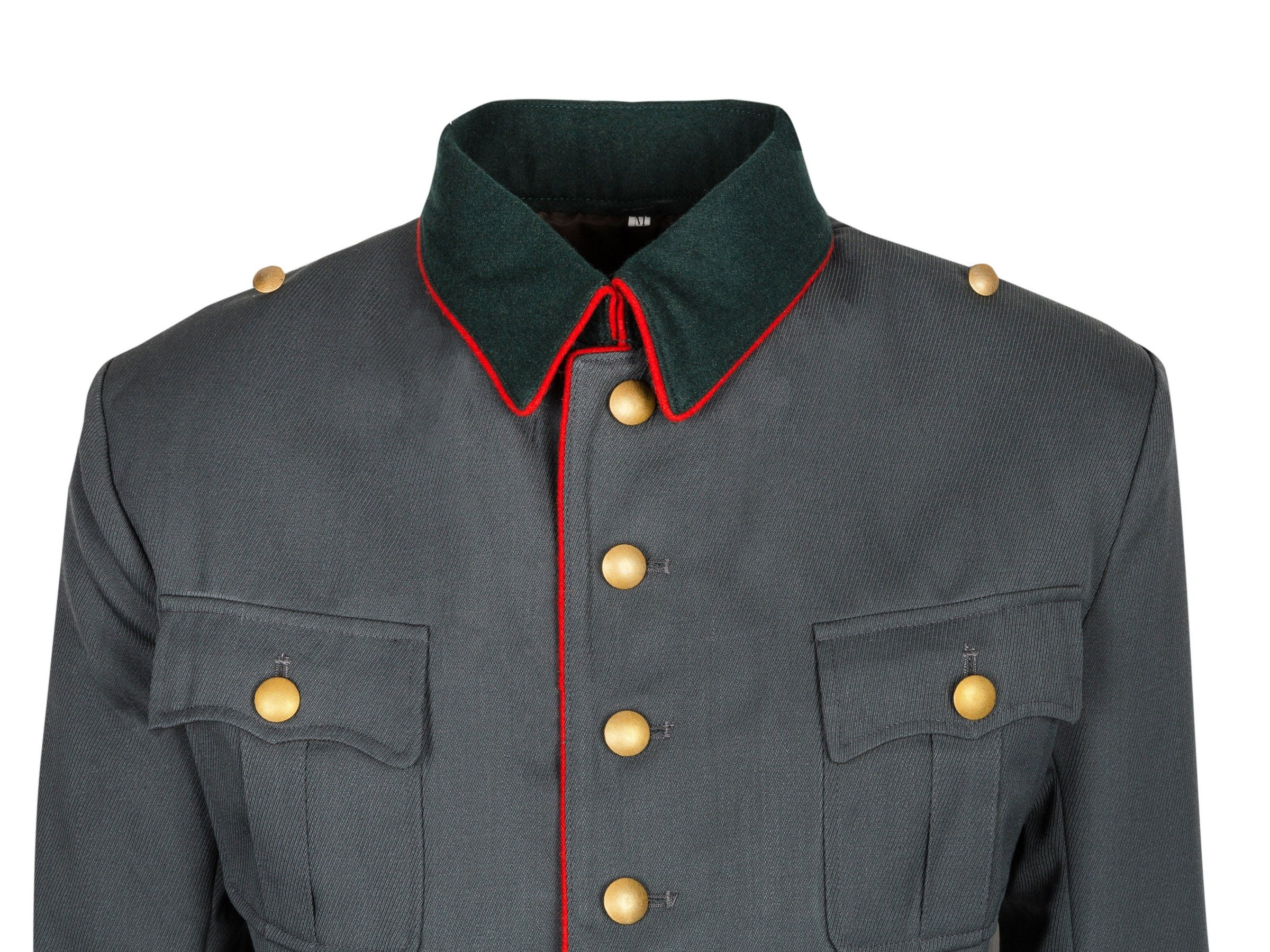 Doskonała replika generalskiej bluzy gabardynowej - Feldbluse für Generale. Bluza jest wykonana z dużą dbałością o szczegóły - doskonale odtworzony materiał gabardynowy, groszkowane guziki koloru złotego, zaczep do kordzika, podszewka. Bluza z czerwonym kantem wzdłuż listwy z guzikami, kołnierza oraz mankietów francuskich. Kołnierz, wykonany z sukna w ciemnozielonym kolorze zapinany jest na haftki. Polecamy - jest to replika klasy Premium, produkcja na zlecenie Nestof®!