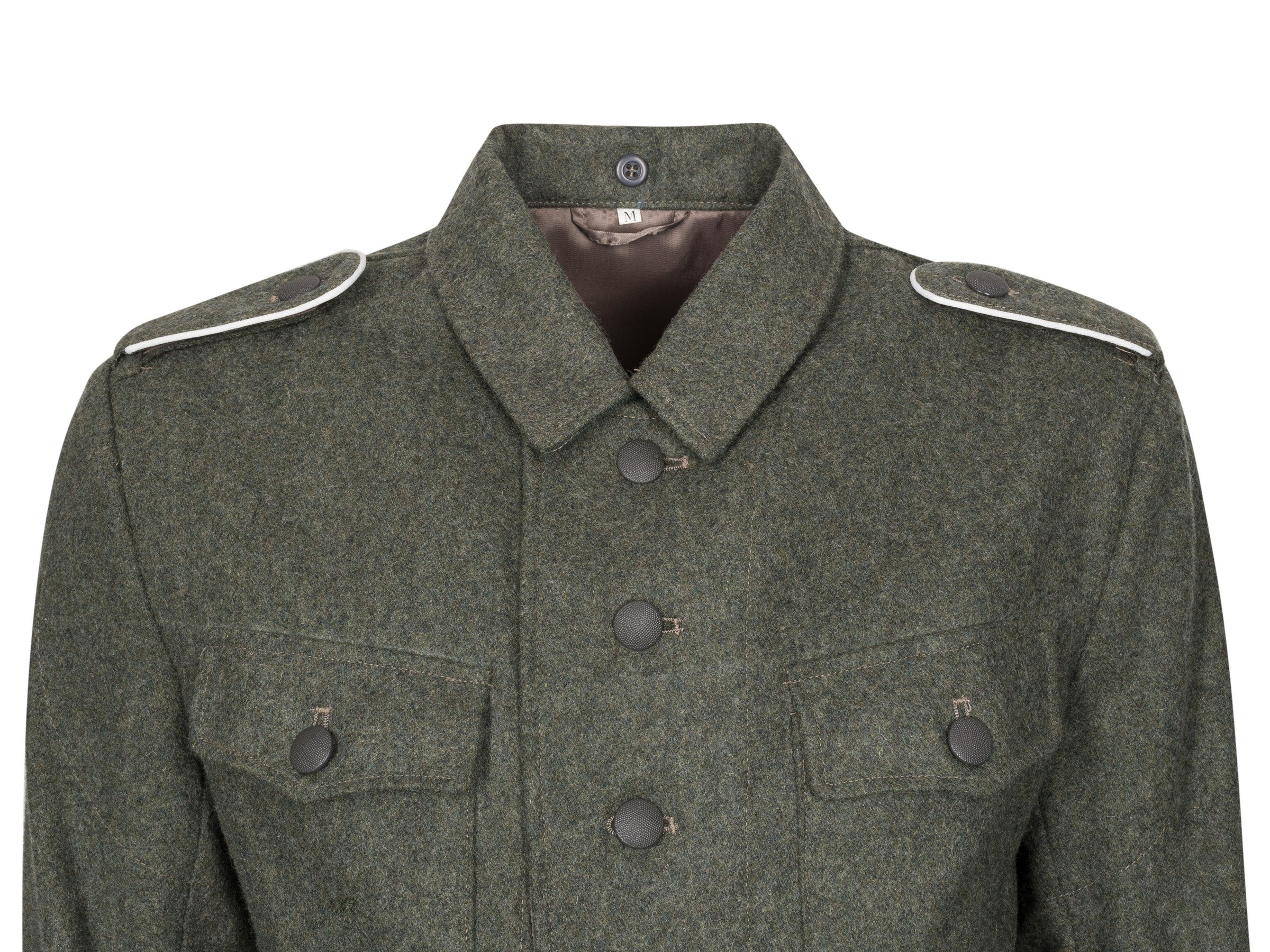 Wierna replika bluzy mundurowej Feldbluse M42, 6cio guzikowej, wykonana z sukna w kolorze Feldgrau. Bluza w wersji dla WH. W stosunku do bluzy poprzednich wzorów, bluza M42 to pierwsze uproszczenia i oszczędności materiałowe - tym razem widać to głównie na kieszeniach. Bluza posiada naramienniki w brawie broni piechoty - biały. Bluza wykonana z dużą dbałością o szczegóły, wyprodukowana bezpośrednio na zlecenie Nestof® - w bardzo wysokiej jakości.