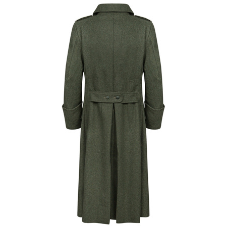 Replika płaszcza niemieckiego M40, wykonana z sukna. Najlepsza możliwa replika na rynku, w idealnie odtworzonym odcieniu feldgrau. Dokładne odwzorowanie kroju, koloru i wszelkich szczegółów. 2 rzędy guzików, podszewka bawełniana, kołnierz w kolorze sukna.