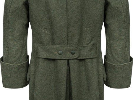 Replika płaszcza niemieckiego M40, wykonana z sukna. Najlepsza możliwa replika na rynku, w idealnie odtworzonym odcieniu feldgrau. Dokładne odwzorowanie kroju, koloru i wszelkich szczegółów. 2 rzędy guzików, podszewka bawełniana, kołnierz w kolorze sukna.