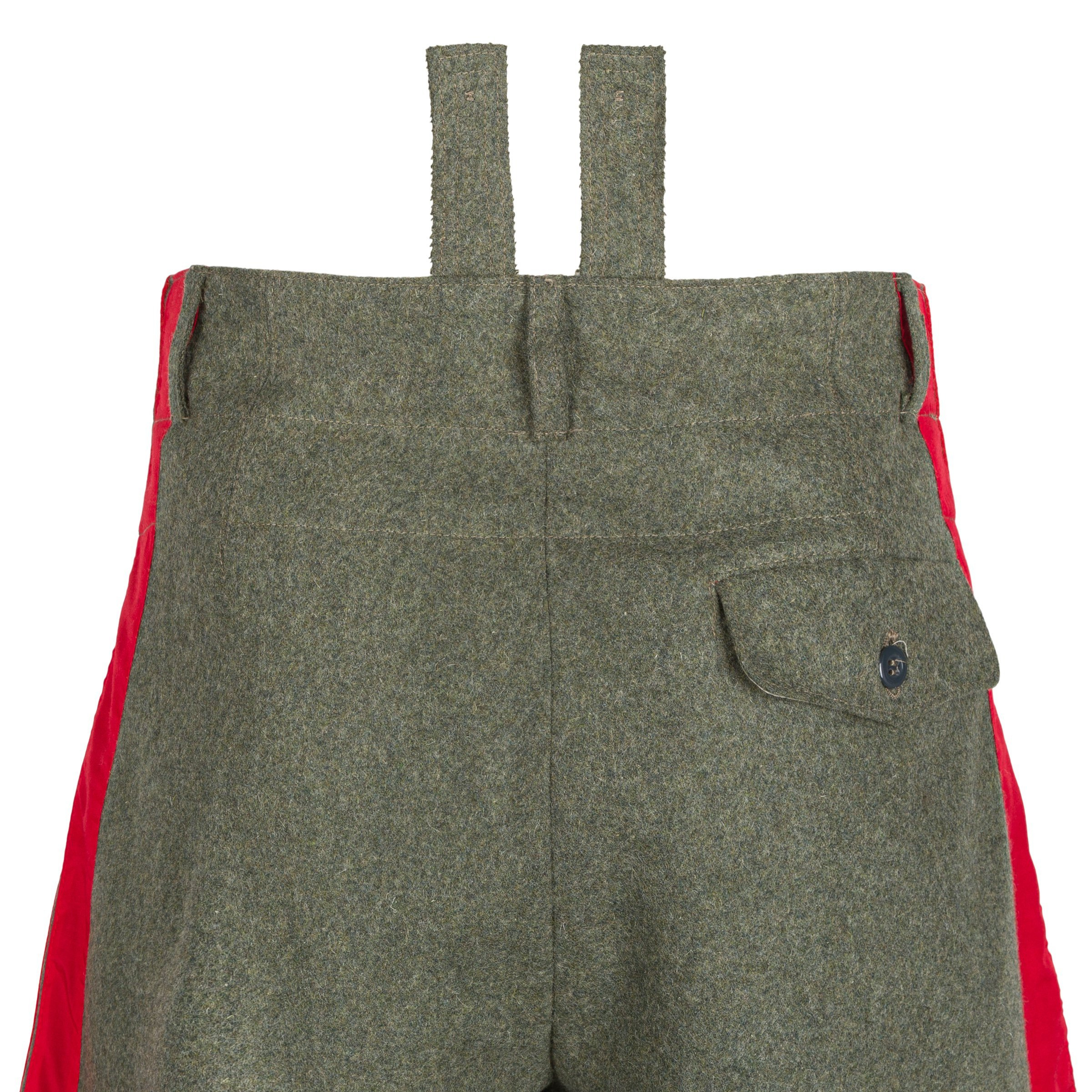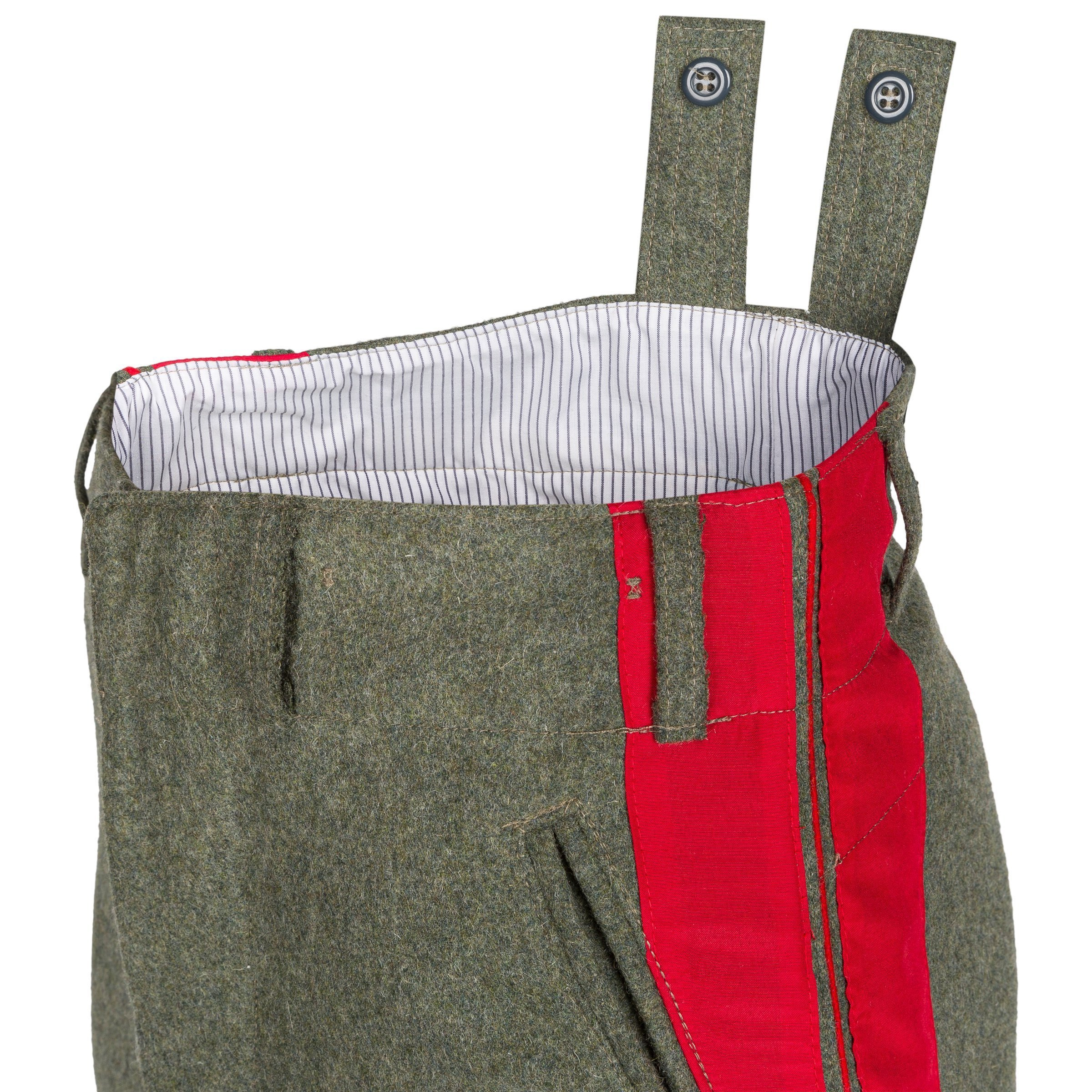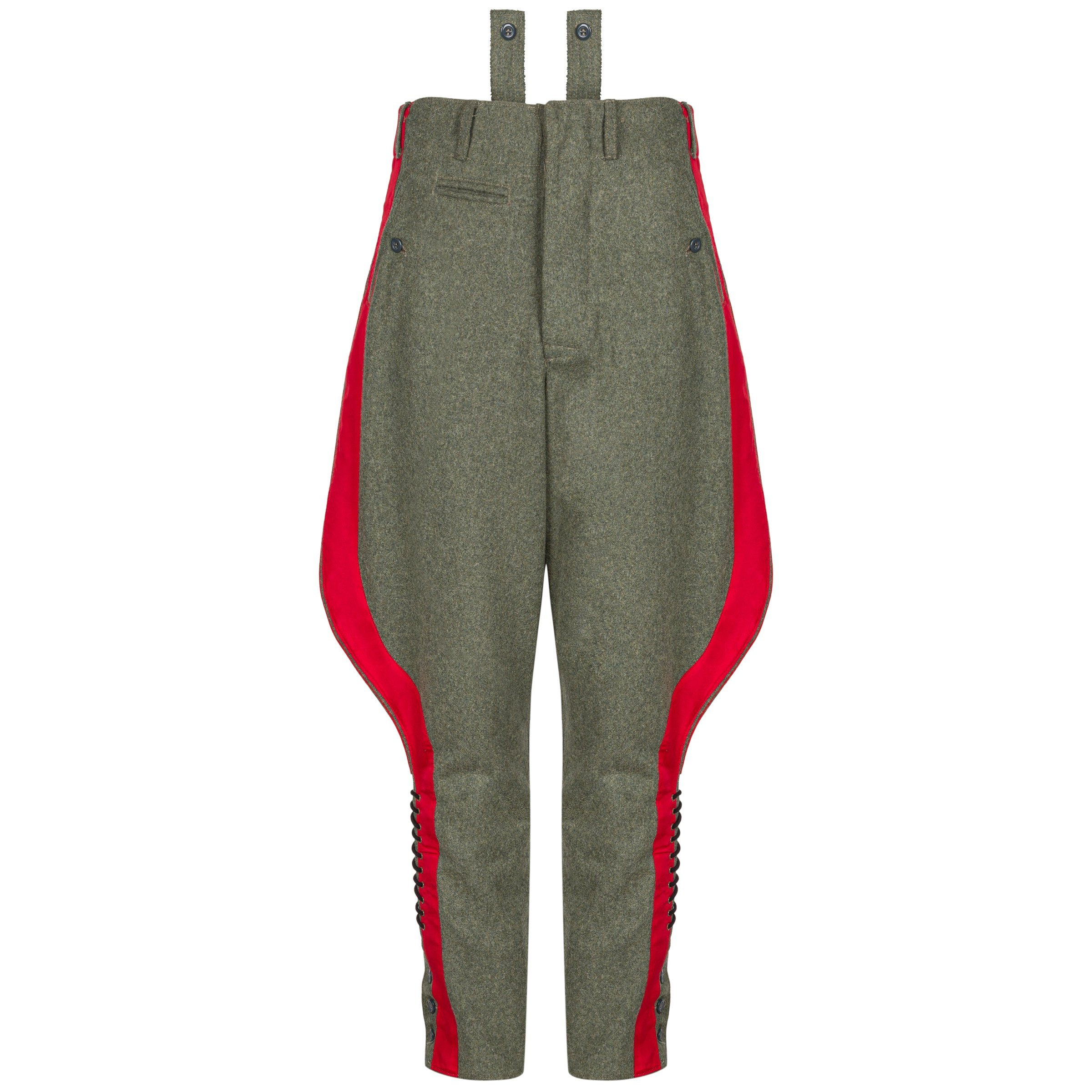Doskonała replika sukiennych generalskich bryczesów dla wojsk lądowych Wehrmachtu - Reithose. Bryczesy wykonane są z sukna w kolorze feldgrau, posiadają szeroką czerwoną lamówkę oraz poprawną podszewkę. Zdecydowanie polecamy - produkcja na zlecenie Nestof®!