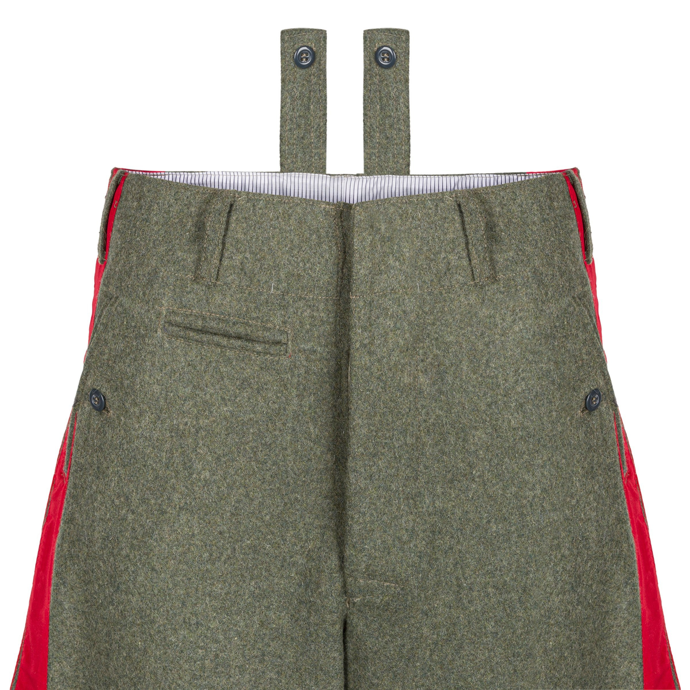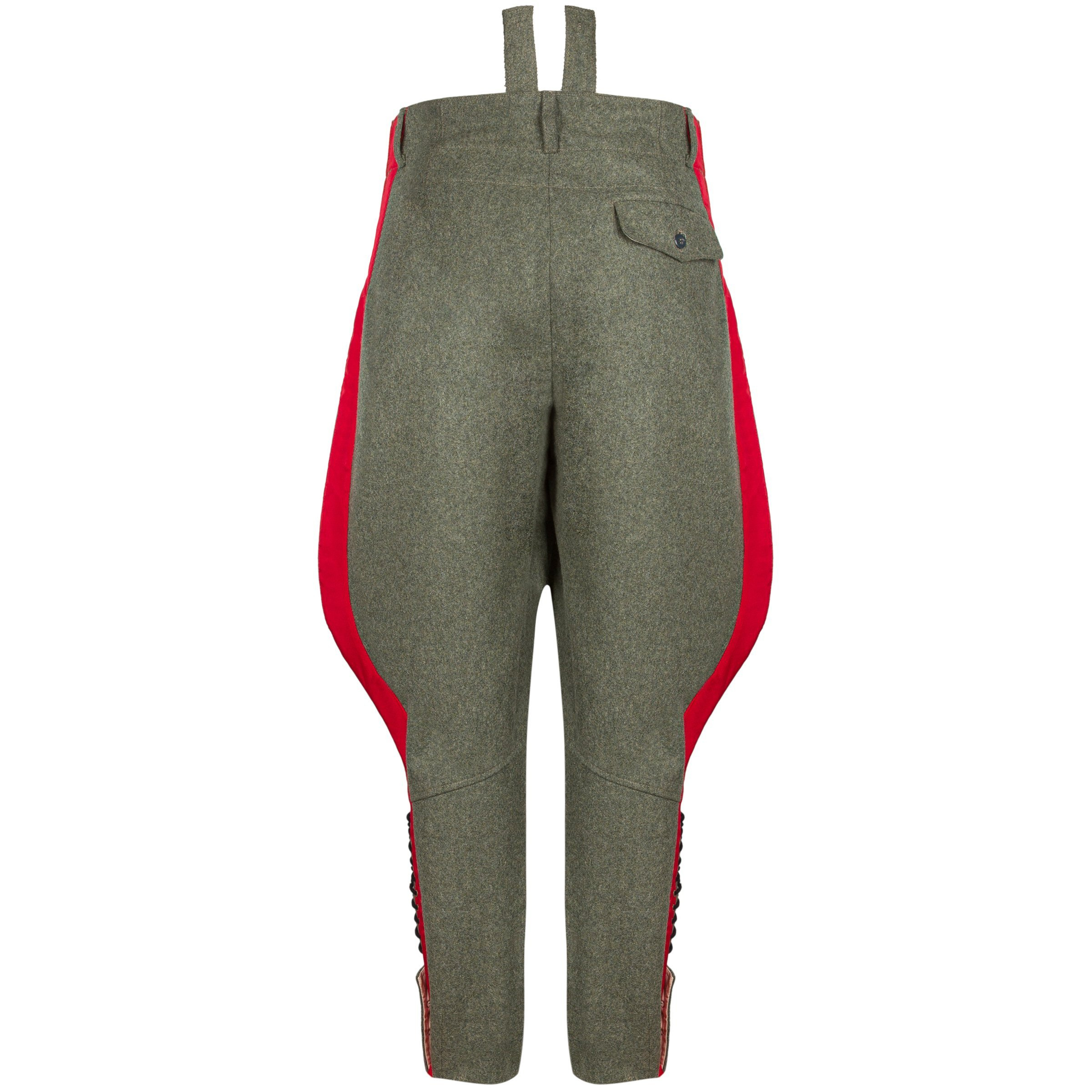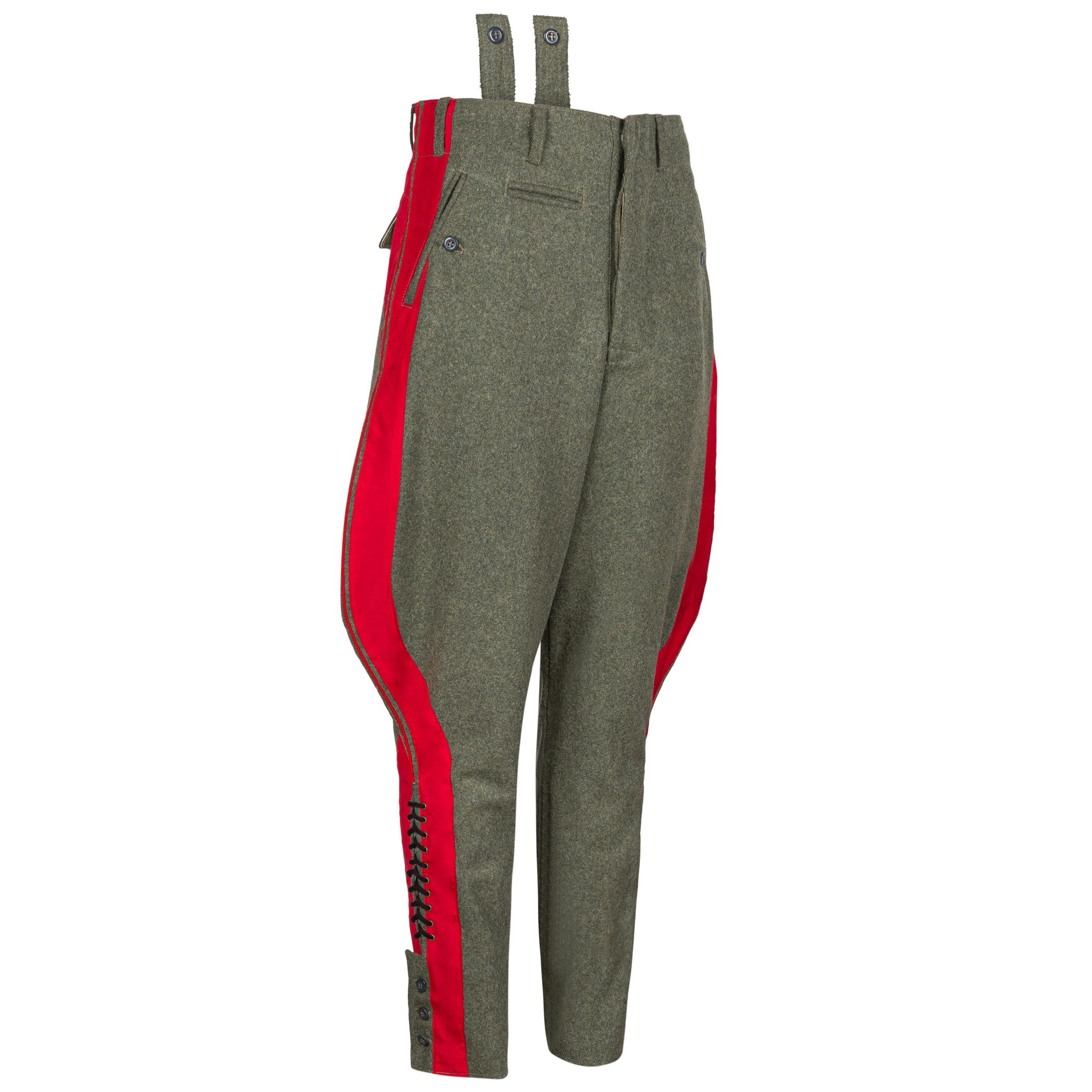 Doskonała replika sukiennych generalskich bryczesów dla wojsk lądowych Wehrmachtu - Reithose. Bryczesy wykonane są z sukna w kolorze feldgrau, posiadają szeroką czerwoną lamówkę oraz poprawną podszewkę. Zdecydowanie polecamy - produkcja na zlecenie Nestof®!