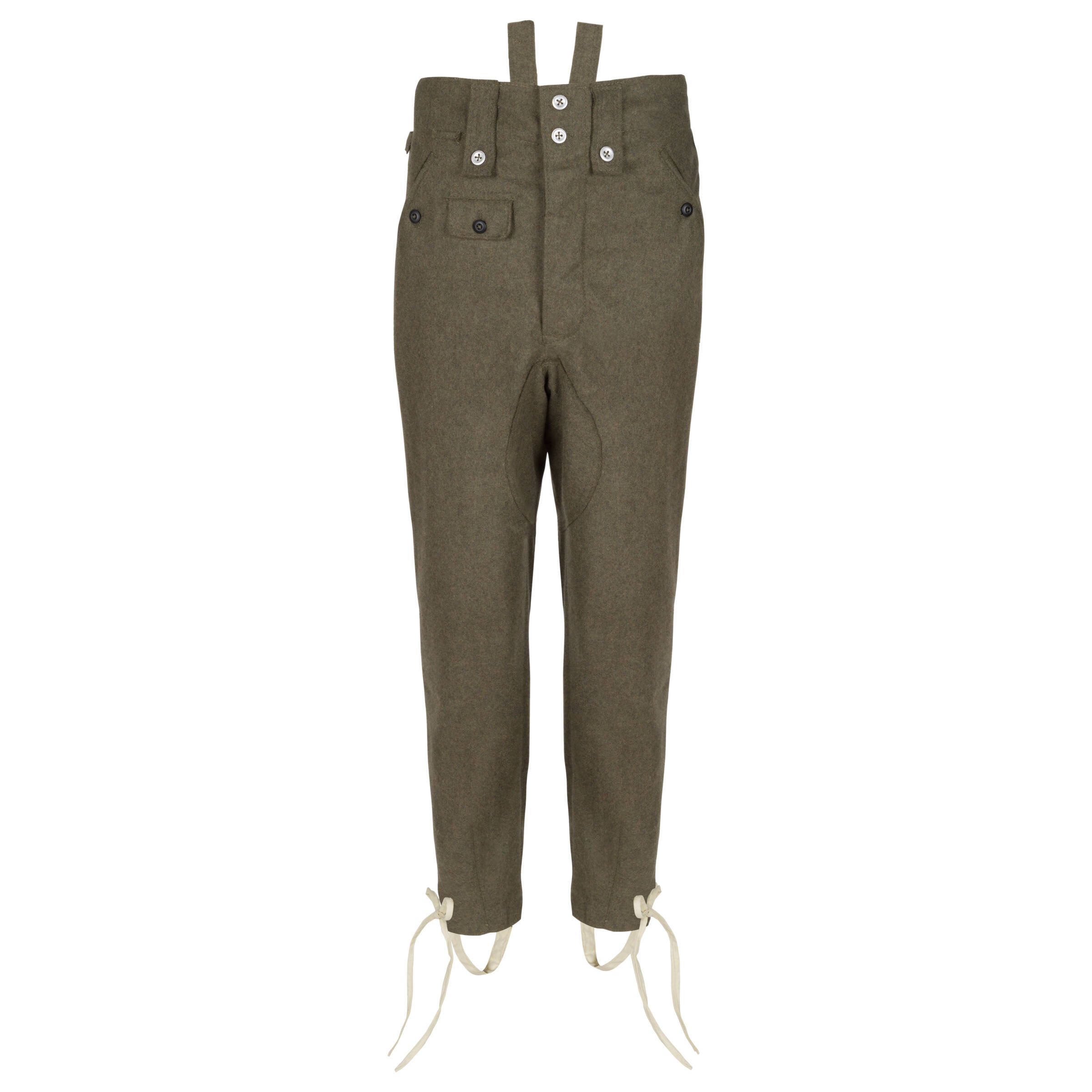 Replika spodni do munduru polowego, wykonana z sukna z bawełnianą podszewką. Spodnie nogawki mają zwężone na końcach, dzięki czemu idealnie pasują do trzewików. Spodnie wykonane z dużą dbałością o szczegóły - kolor, grubość, guziki i wzmocnienia są wykonane identycznie jak w oryginale. Spodnie posiadają dwie kieszenie z przodu i jedną z tyłu, wszystkie zapinane na guziki a także kieszonkę na zegarek z klapką. Guziki do szelek na tylnych paskach i po wewnętrznej stronie pasa z przodu.