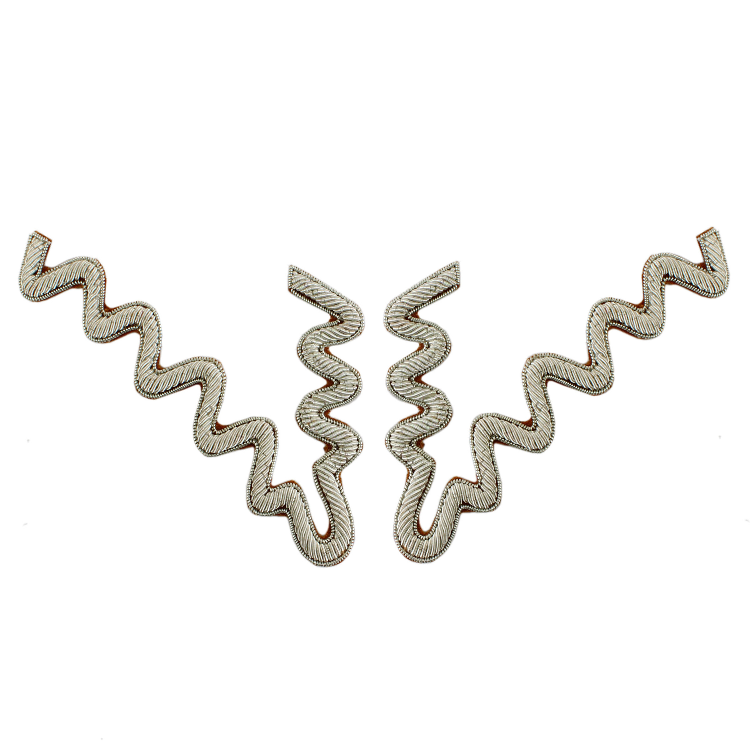 Doskonała replika wężyków na kołnierz podoficerów kawalerii WP II RP. Wężyki haftowane metalowym bajorkiem, wzór zgodny z oryginałem. Wężyki posiadają cienką podkładkę, umożliwiającą przyszycie ich do kołnierza.