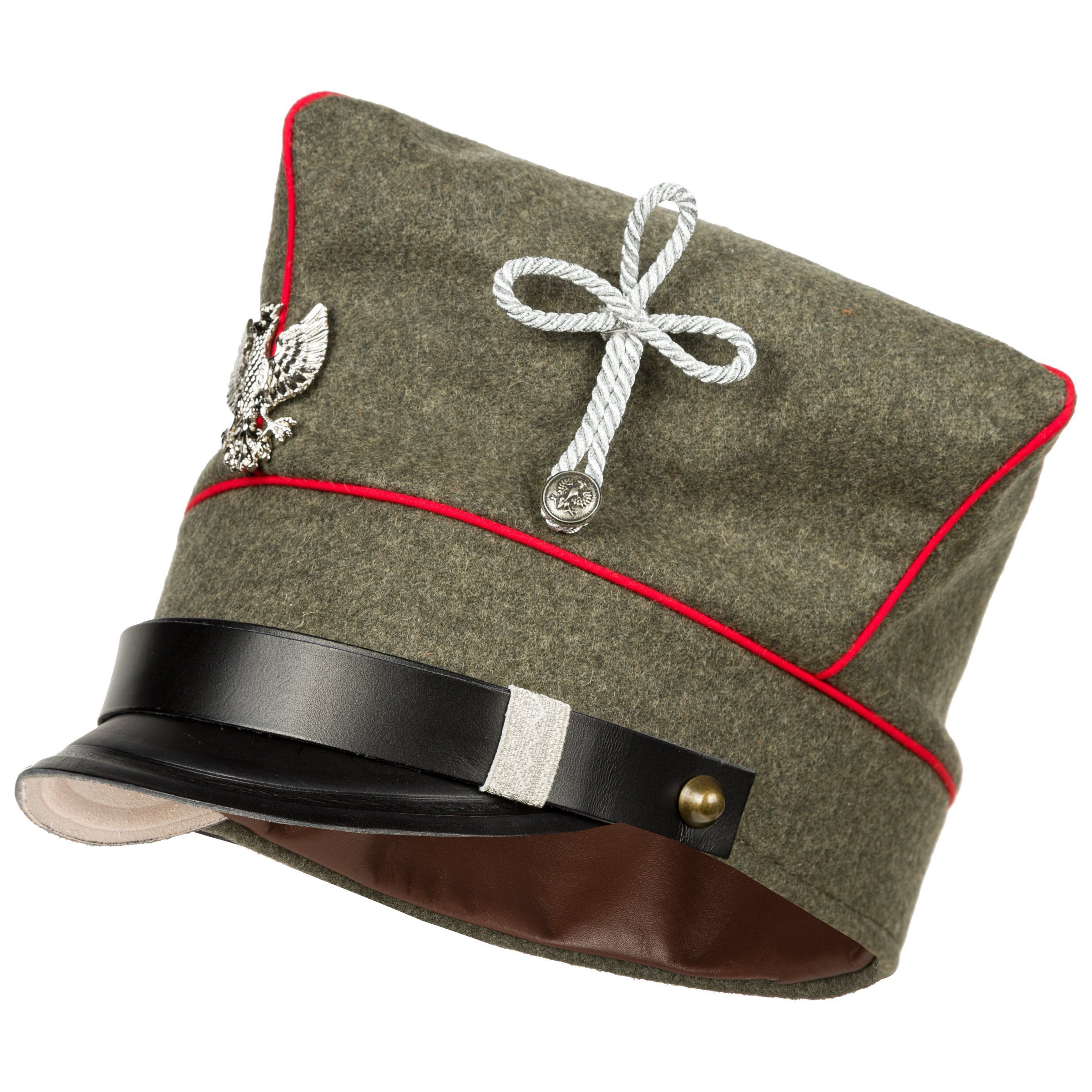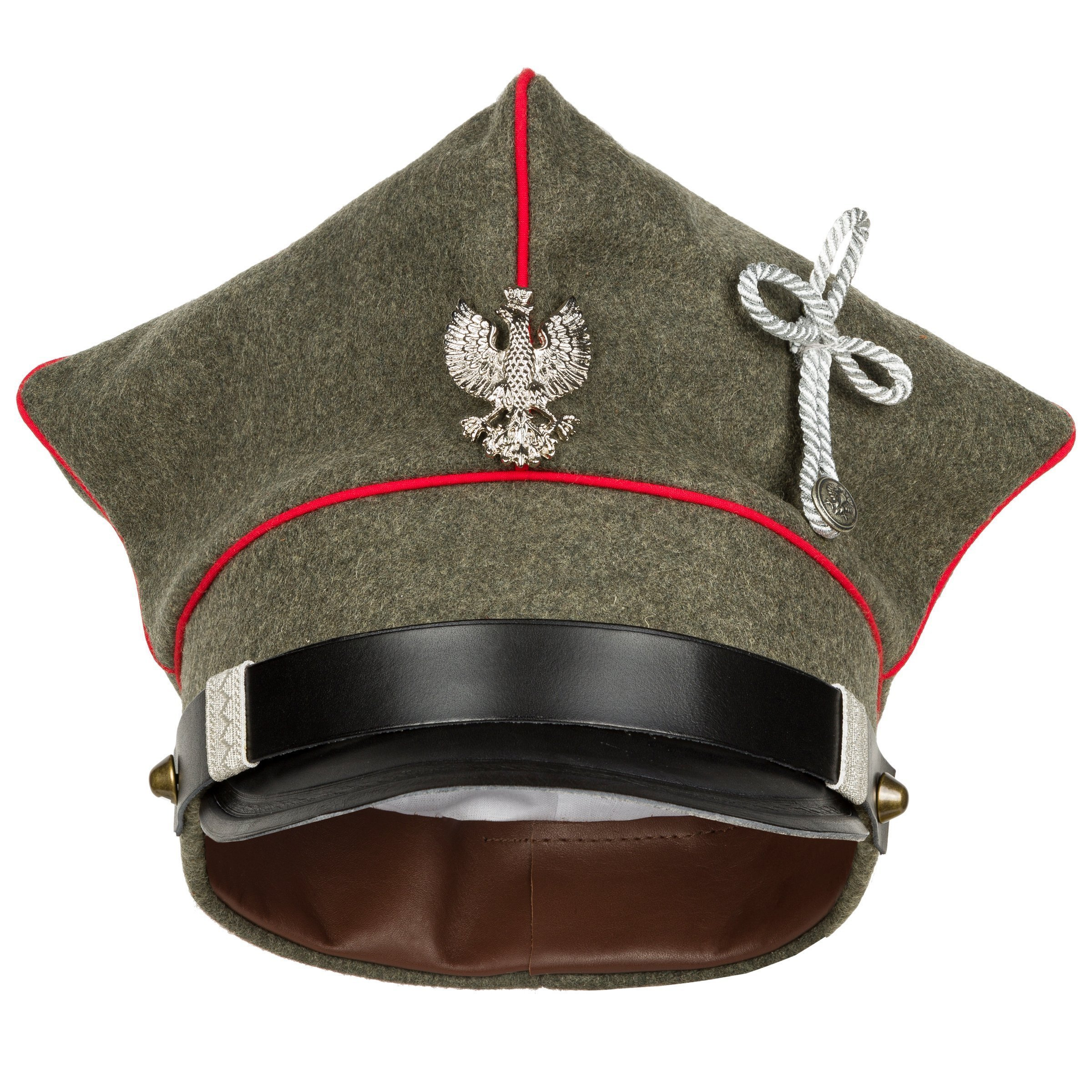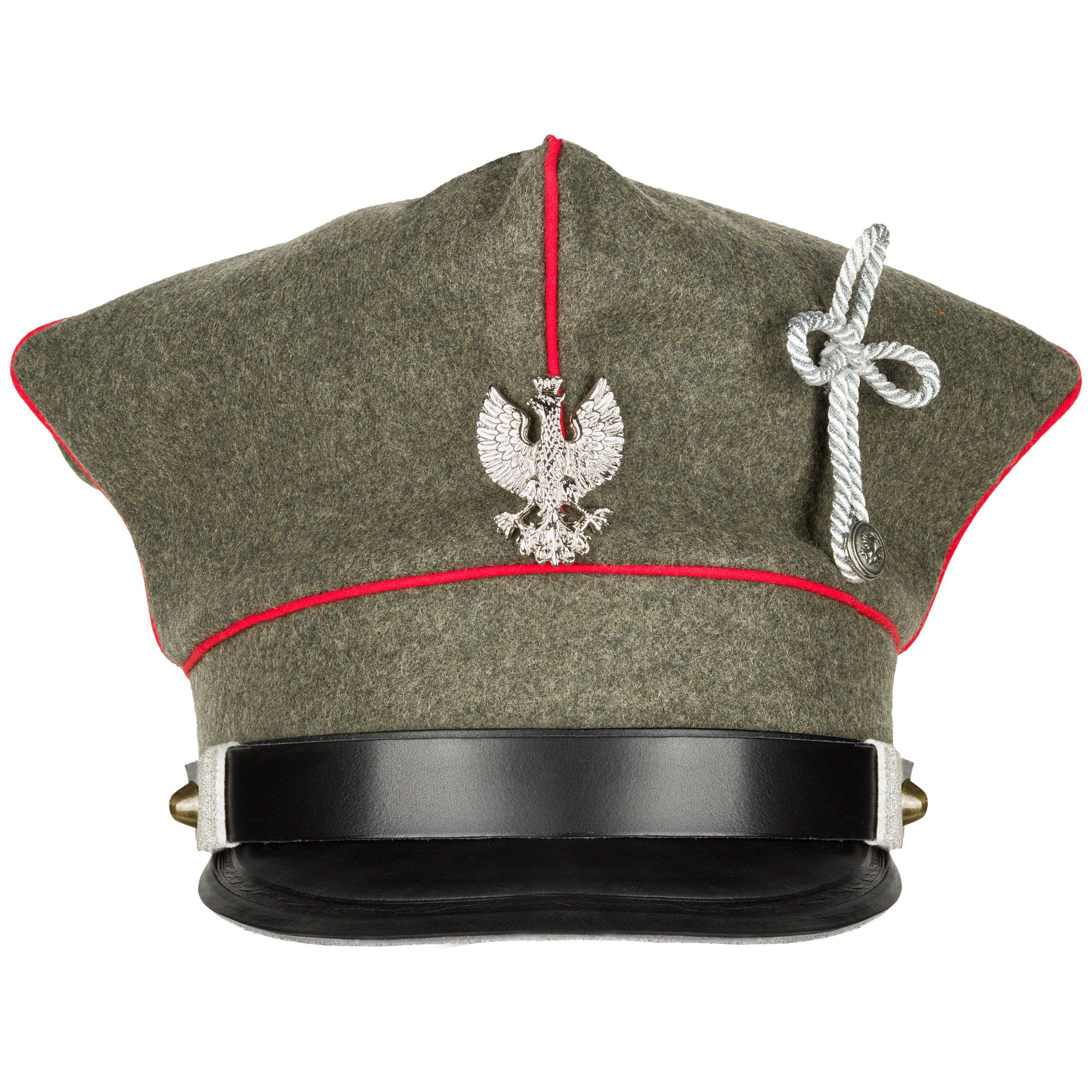Doskonała replika rogatywki Armii Wielkopolskiej w wersji oficerskiej. Czapka uszyta z naturalnych materiałów - sukna w pierwszowojennym odcieniu feldgrau, podszewka z naturalnej białej bawełny , natomiast pasek, daszek i potnik wykonane są ze skóry licowej bydlęcej, roślinnego garbowania. Daszek i pasek są w kolorze czanym. Do rogatywki dołączony jest orzełek wielkopolski w wersji rzemieślnicznej - nie jest przymocowany, gdyż w Wojskach Wielkopolskich mocowane je na różnych wysokościach. Zdecydowanie polecamy - replika z najwyższej półki, produkcja własna Nestof®!