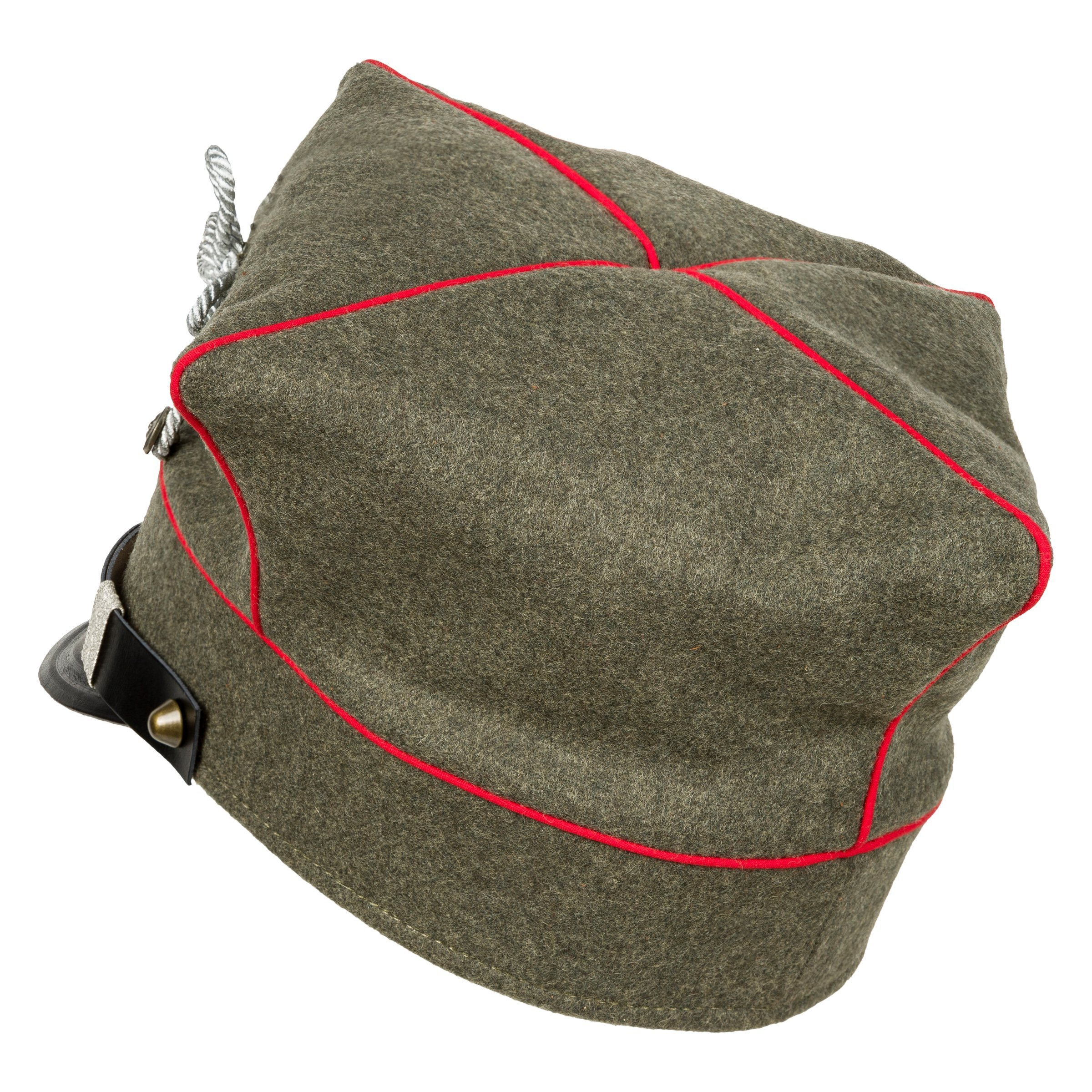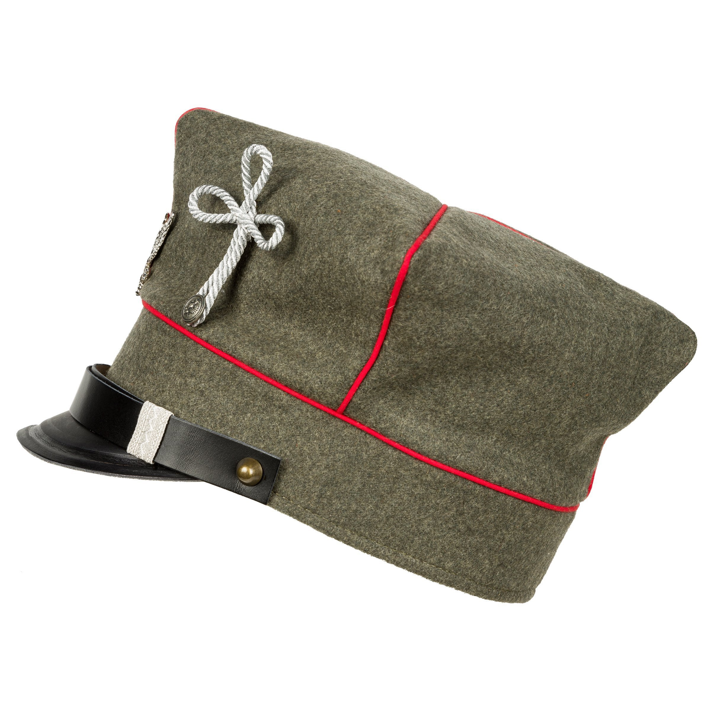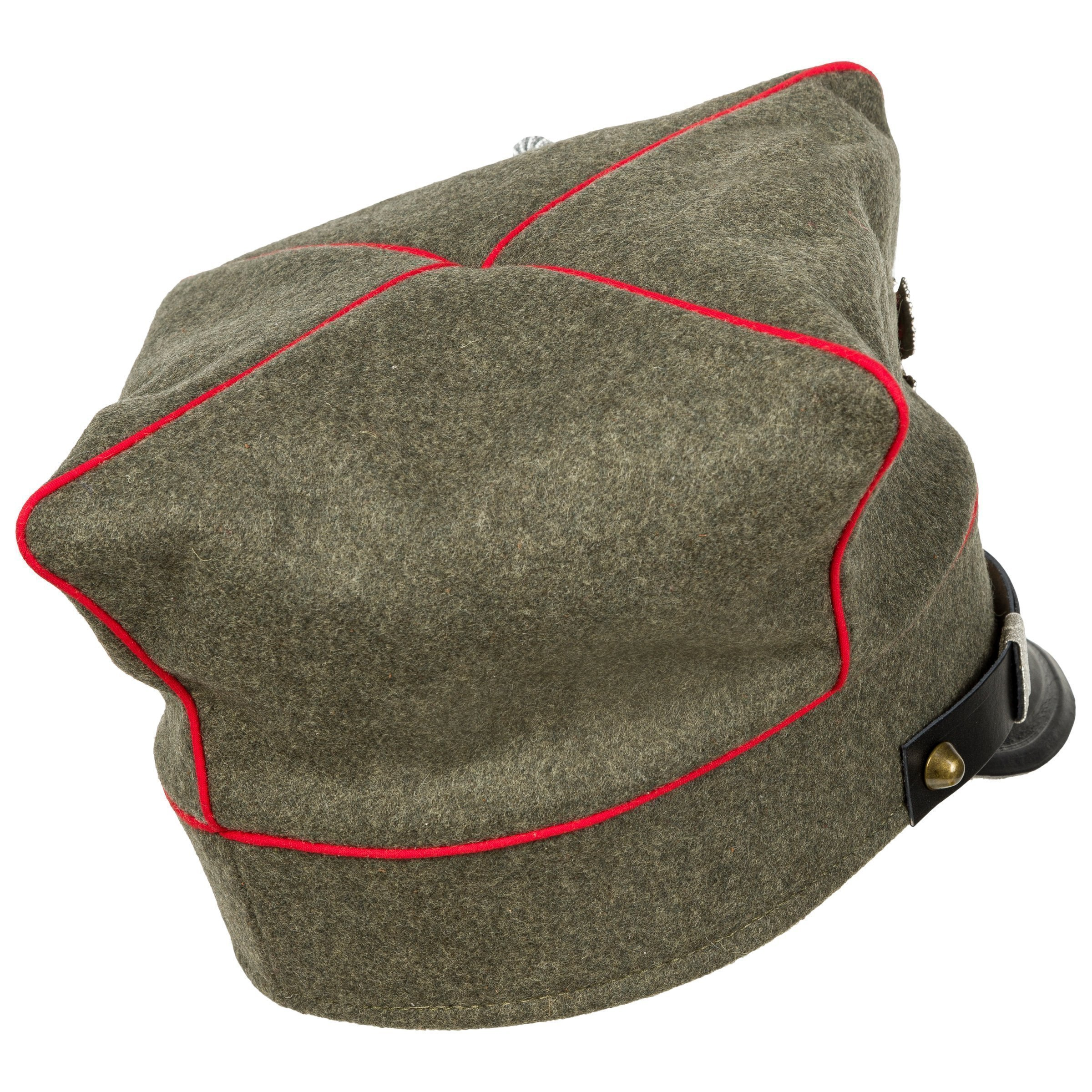 Doskonała replika rogatywki Armii Wielkopolskiej w wersji oficerskiej. Czapka uszyta z naturalnych materiałów - sukna w pierwszowojennym odcieniu feldgrau, podszewka z naturalnej białej bawełny , natomiast pasek, daszek i potnik wykonane są ze skóry licowej bydlęcej, roślinnego garbowania. Daszek i pasek są w kolorze czanym. Do rogatywki dołączony jest orzełek wielkopolski w wersji rzemieślnicznej - nie jest przymocowany, gdyż w Wojskach Wielkopolskich mocowane je na różnych wysokościach. Zdecydowanie polecamy - replika z najwyższej półki, produkcja własna Nestof®!