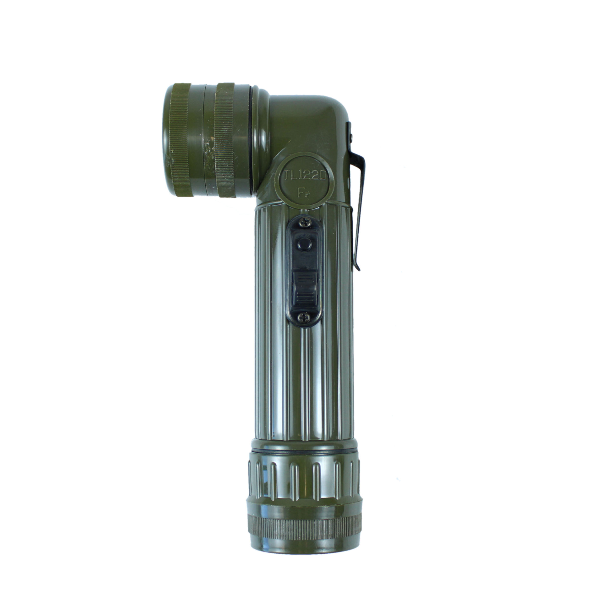 Oryginalna francuska latarka kątowa TL-122D-Fr wykonana z tworzywa sztucznego w kolorze oliwkowym. Kopia wzoru TL-122D używanego przez US Army podczas II Wojny Światowej. Latarka w wersji bez osłonki włącznika. Latarka jest zasilana 2 bateriami LR20 (brak baterii w zestawie). Powojenny demobil z produkcji dla francuskich sił zbrojnych. Model z zapasów wojskowych. Zapakowany w oryginalny kartonik i folię. Latarka posiada zaczep umożliwiający montaż na pasie lub szelkach. W zestawie w denku są filtry i zapasowa żarówka. Nie wybieramy konkretnej sztuki, towar wysyłany losowo. Nie gwarantujemy poprawności działania latarek ani pełnego wyposażenia.