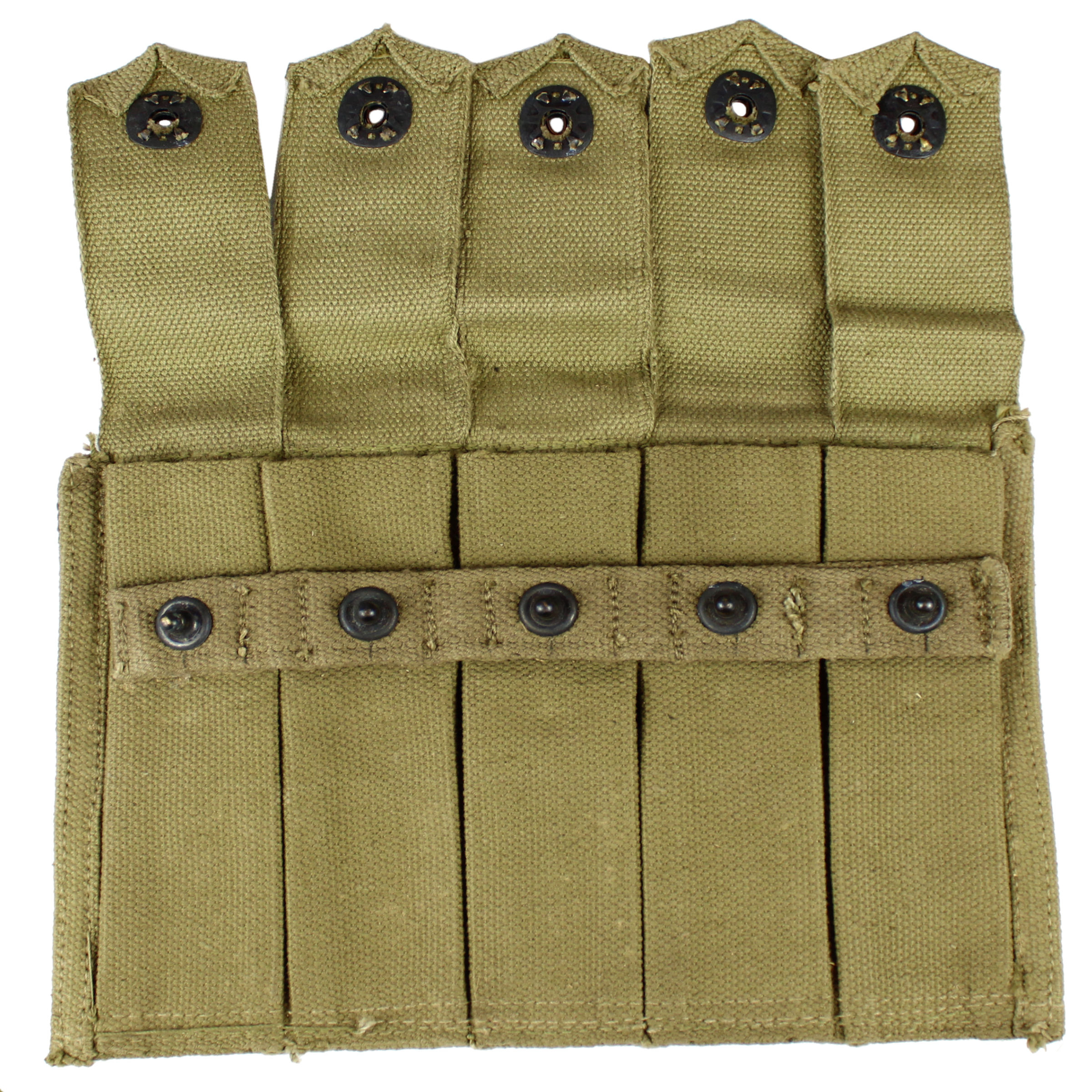 Oryginalna ładownica 5-komorowa Thompson w kolorze oliwkowym do magazynków 20 nabojowych. Ładownica wykonana z płótna bawełnianego z metalowymi, czernionymi zapięciami. Wersja do noszenia na pasie. Standardowy element wyposażenia żołnierzy amerykańskich z lat 40 i 50, sporadycznie wykorzystywany jeszcze w latach 60. Wersja bez oznaczeń producenta, z produkcji Lend Lease dla ZSRR. Mogą występować wersje z elementami bawełnianymi w różnych odcieniach w ramach jednej ładownicy.