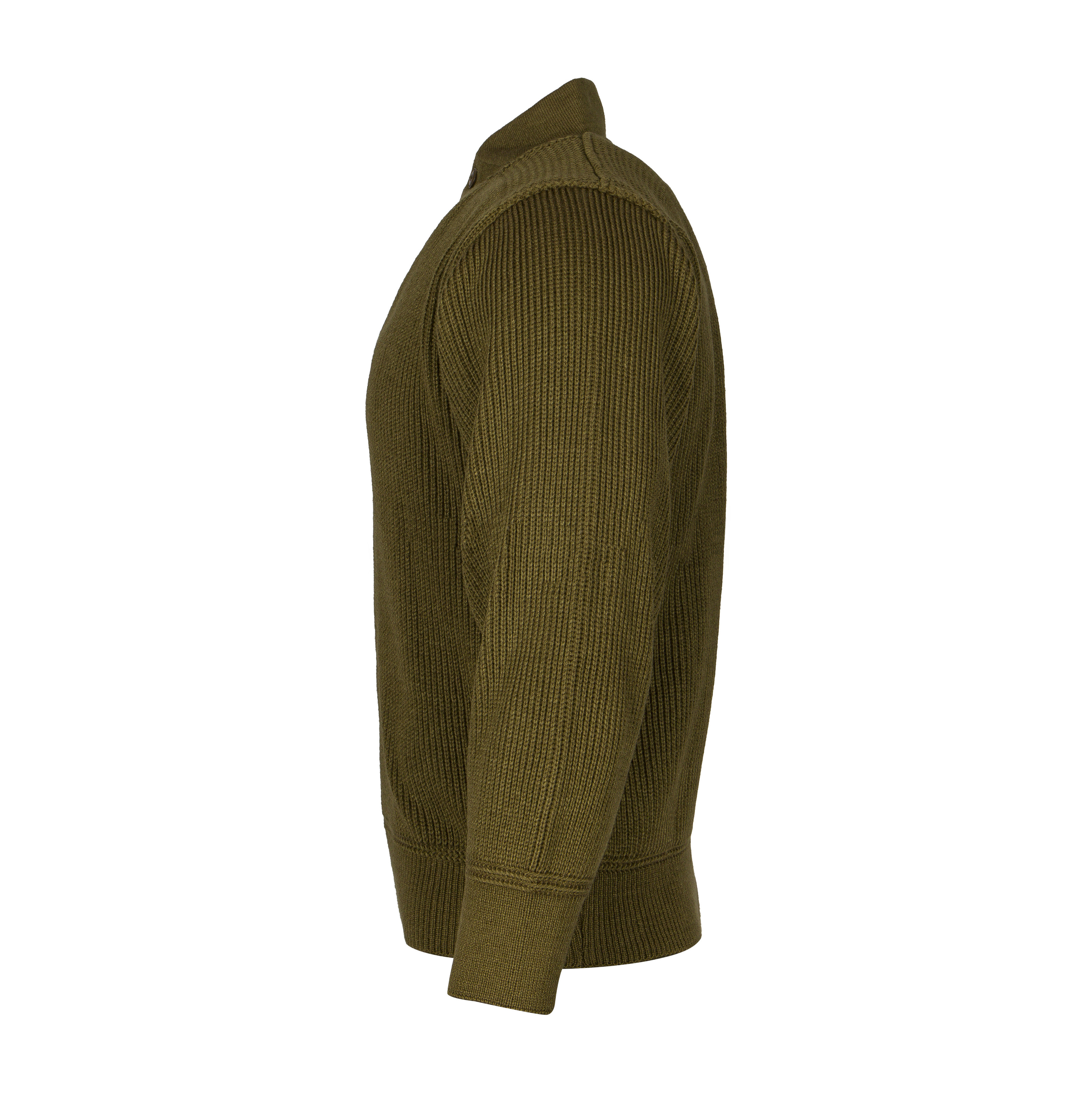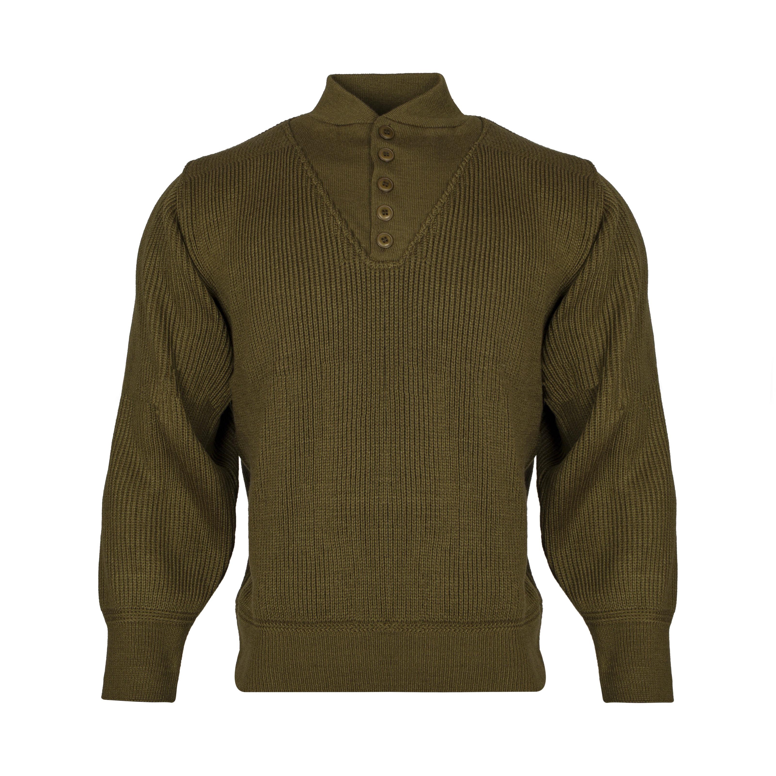 Replika amerykańskiego swetra wełnianego potocznie określanego jako "Sweater High neck". Replika dziana z włókna wełniano-akrylowego w kolorystyce Olive Drab. Zapinana na 5 guzików. Kołnierzyk wysoki wykończony na froncie w stylu V.