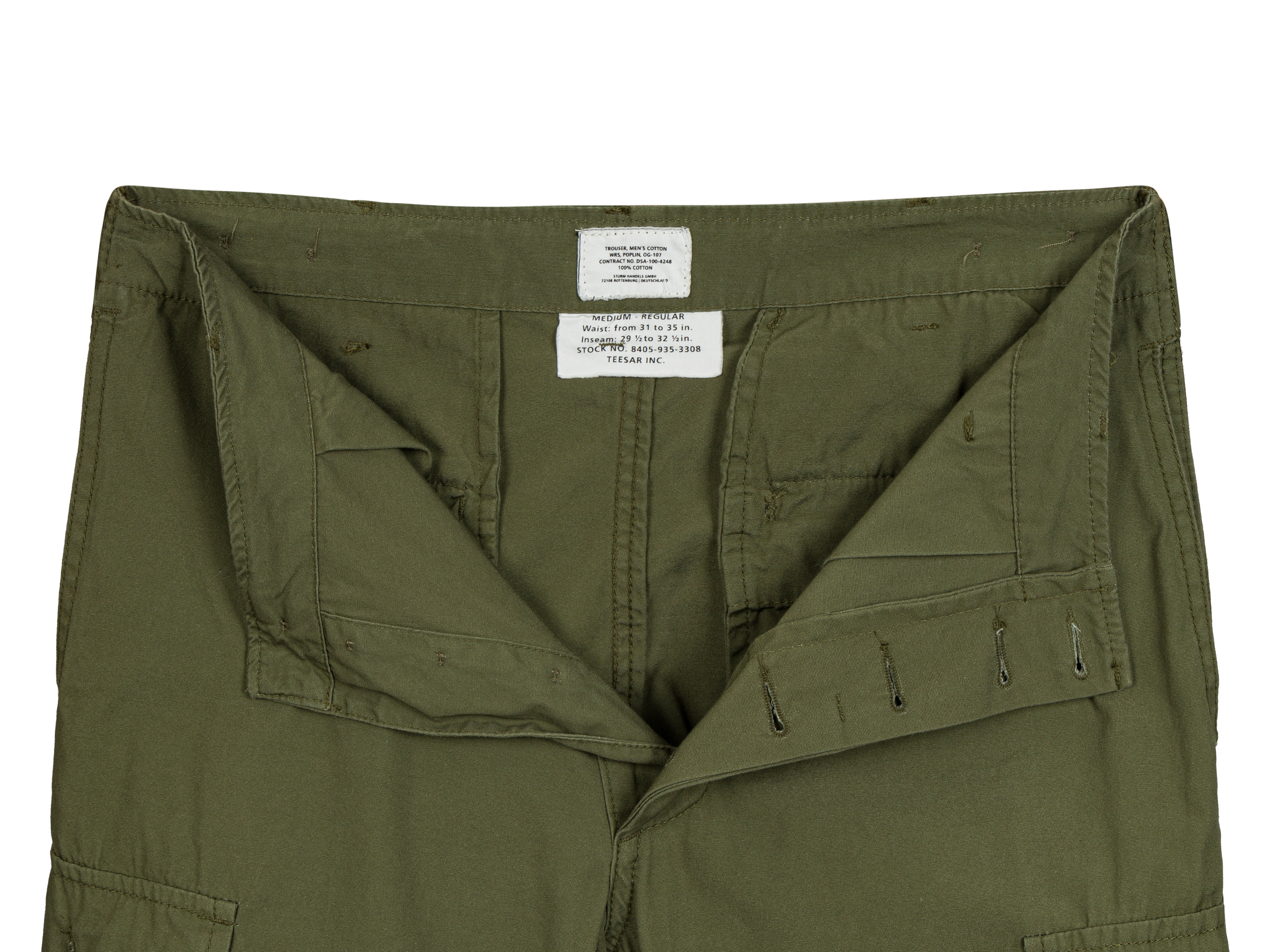 Replika spodni mundurowych TCU "Tropical Combat Uniform", popularnie zwanych "jungle fatigues". Replika przedstawia pierwszy wzór umundurowania, który został zatwierdzony w 1963 roku. Spodnie wykonane z tkaniny bawełnianej w splocie poplin w kolorystyce OG-107. Spodnie posiadają dwie duże kieszenie cargo na wysokości ud oraz dwie mniejsze kieszenie wewnętrzne na pośladkach, wszystkie zapinane guzikami. Dodatkowo standardowe kieszenie typu otwartego na biodrach. Charakterystyczną cechą dla umundurowania TCU pierwszego wzoru są odkryte guziki w kieszeniach (nie przysłonięte klapą).