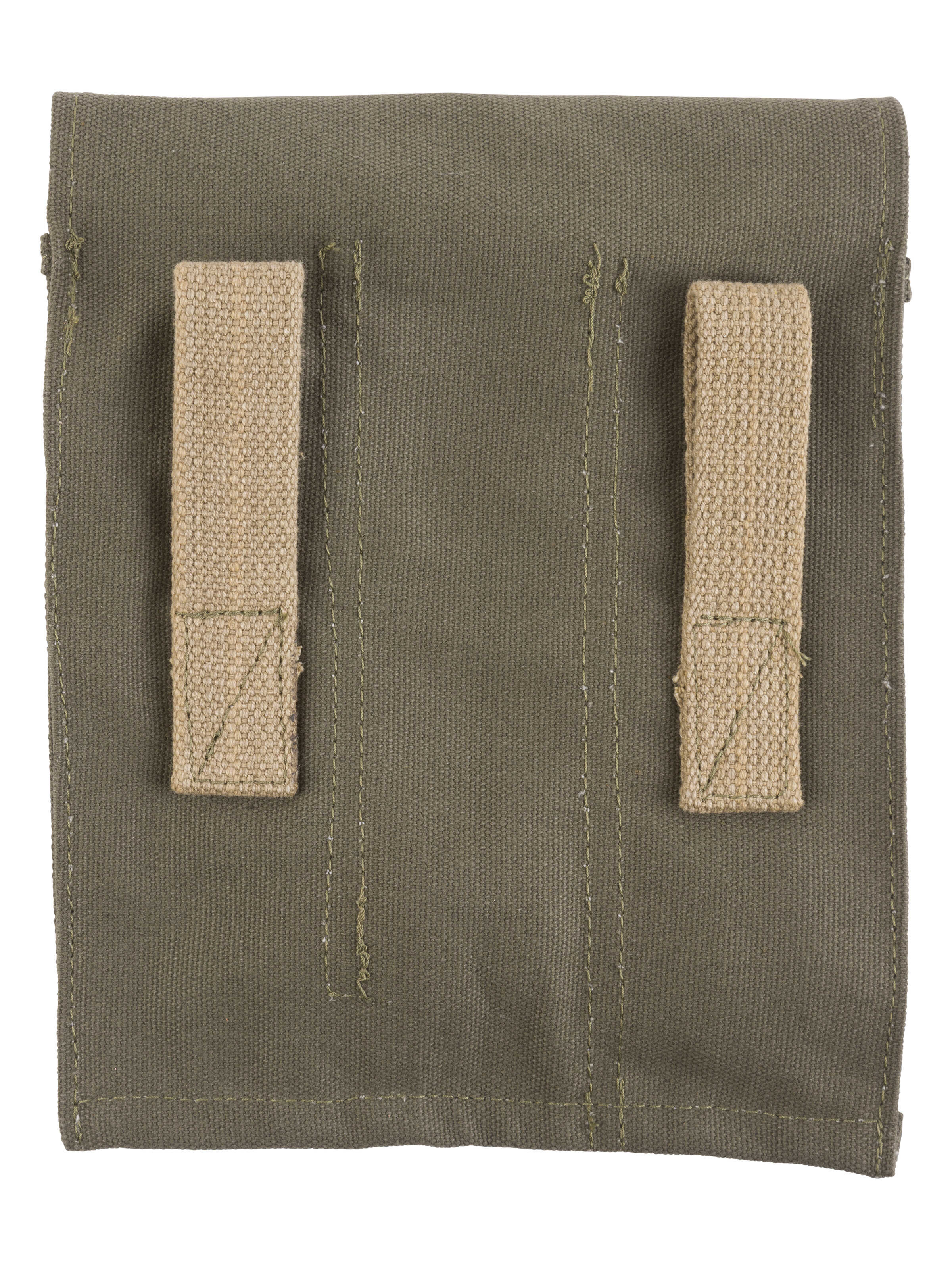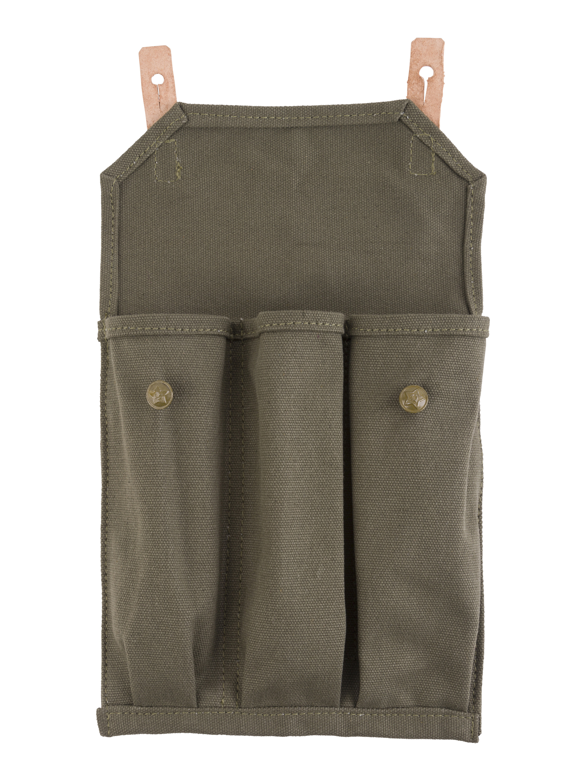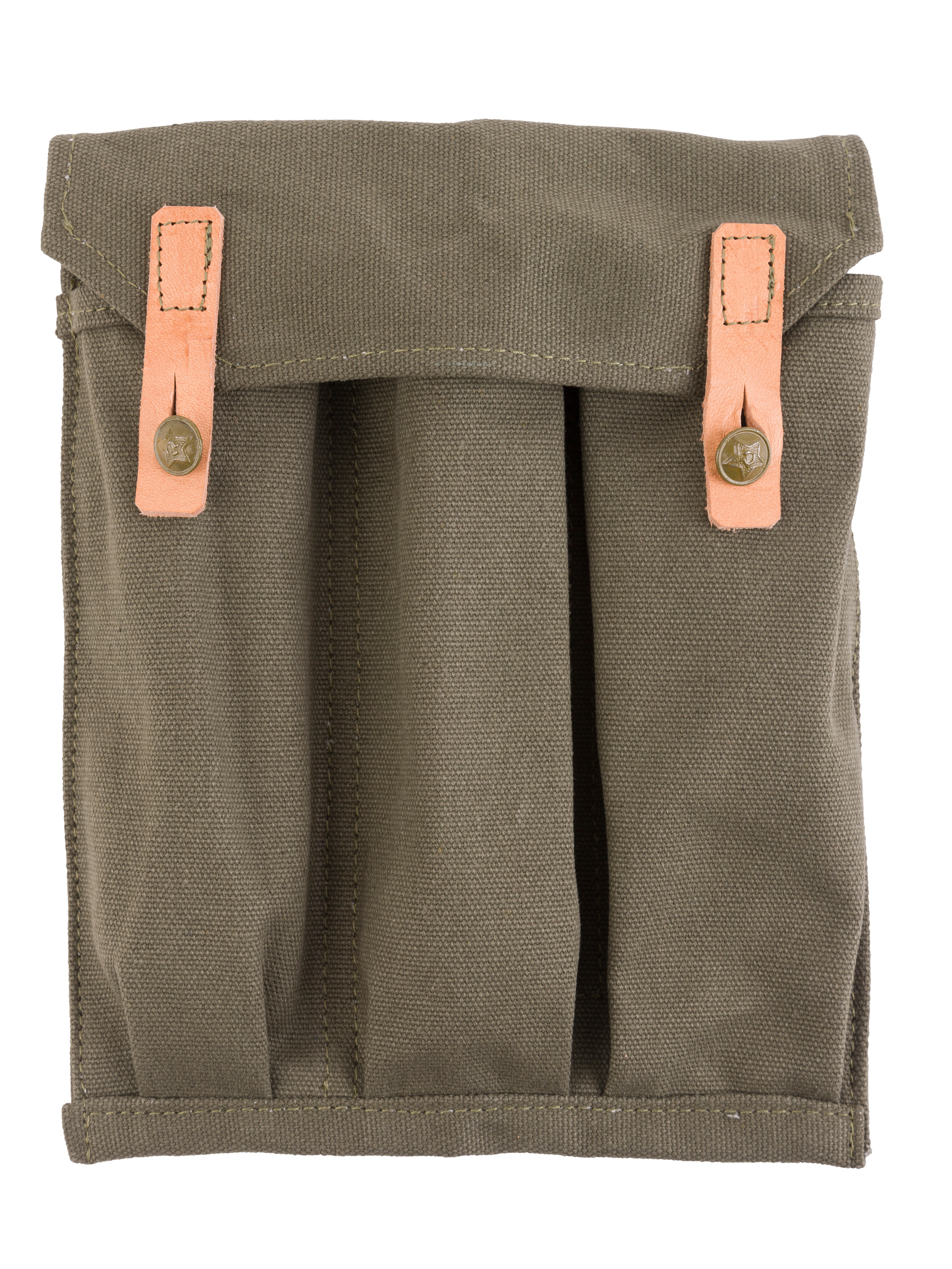 Doskonała replika ładownicy do magazynków PPS. Ładownica wykonana jest z naturalnego bawełnianego brezentu w kolorze khaki, posiada poprawną podszewkę wewnątrz. Ładownica posiada trzy komory na magazynki. Wersja zapinana paskami wykonanymi z naturalnej, niebarwionej skóry na oryginalne guziki, stosowane w gimnastiorkach. Ładownica mocowana do pasa głównego na dwie szlufki z taśmy parcianej.
