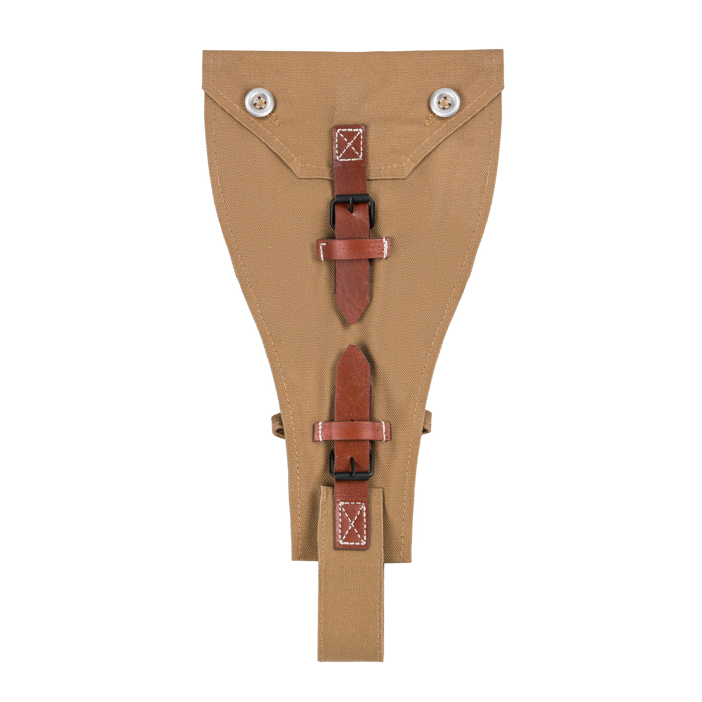 Replika ładownicy na bębnowy magazynek do pistoletu P08 i pistoletu maszynowego MP18. Replika wykonana z bawełnianego płótna w kolorystyce ciemno beżowej. Wstawki skórzane wykonane są z naturalnej skóry barwionej na kolor brązowy. Guziki są aluminiowe, zaś pozostałe okucia wykonano ze stali.