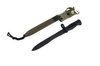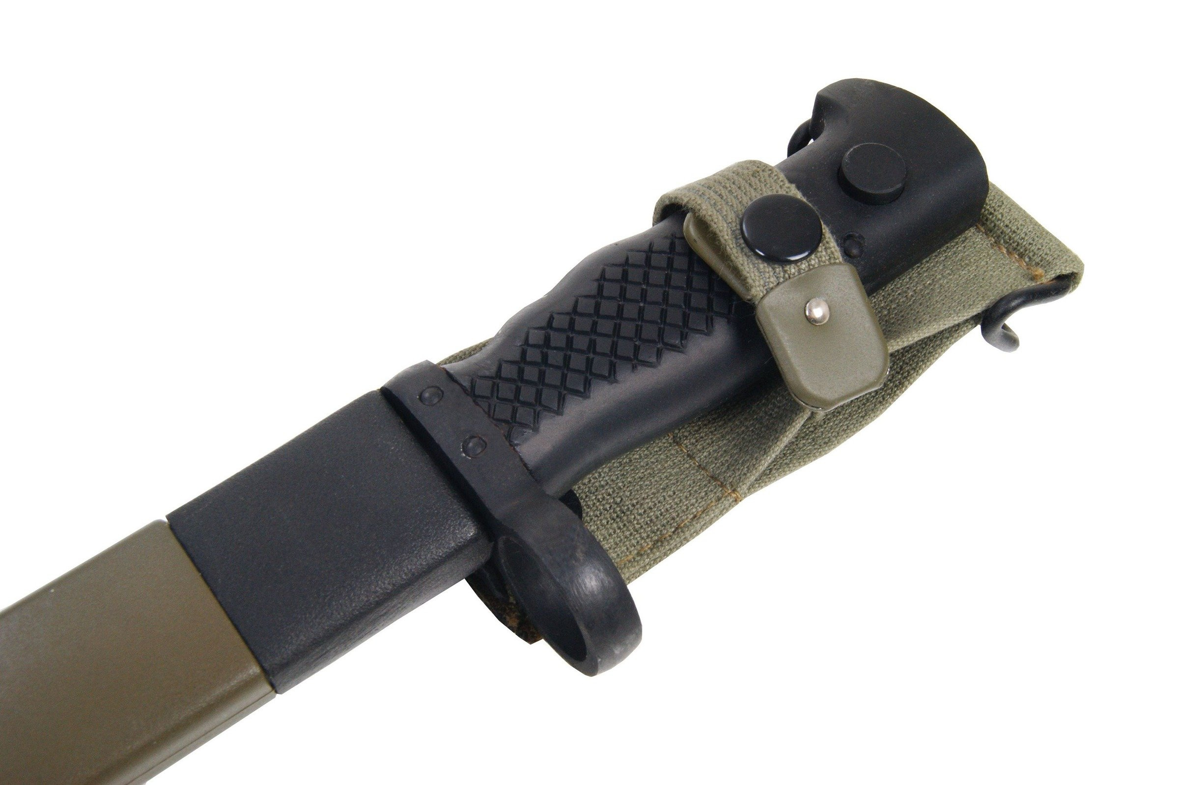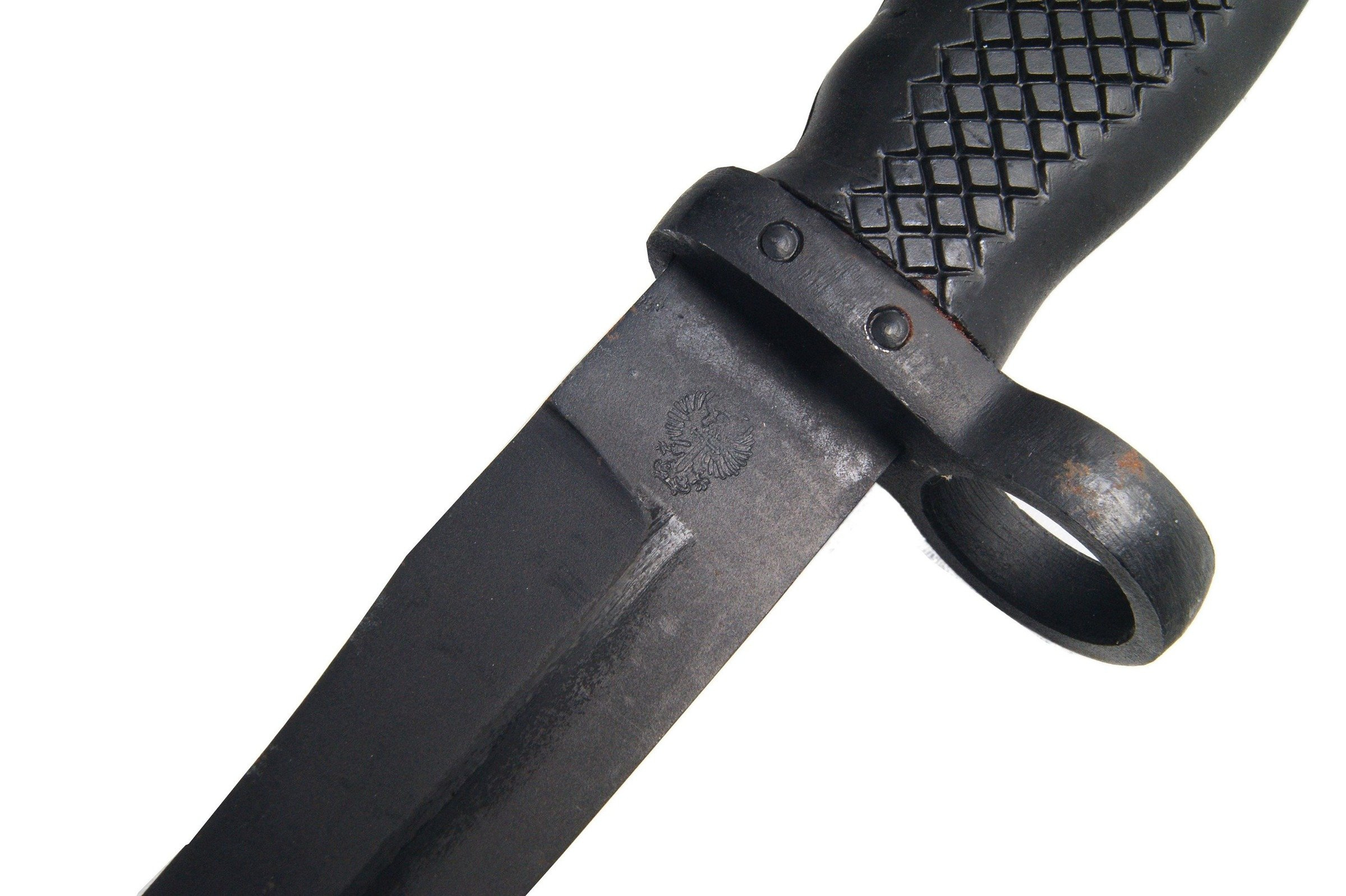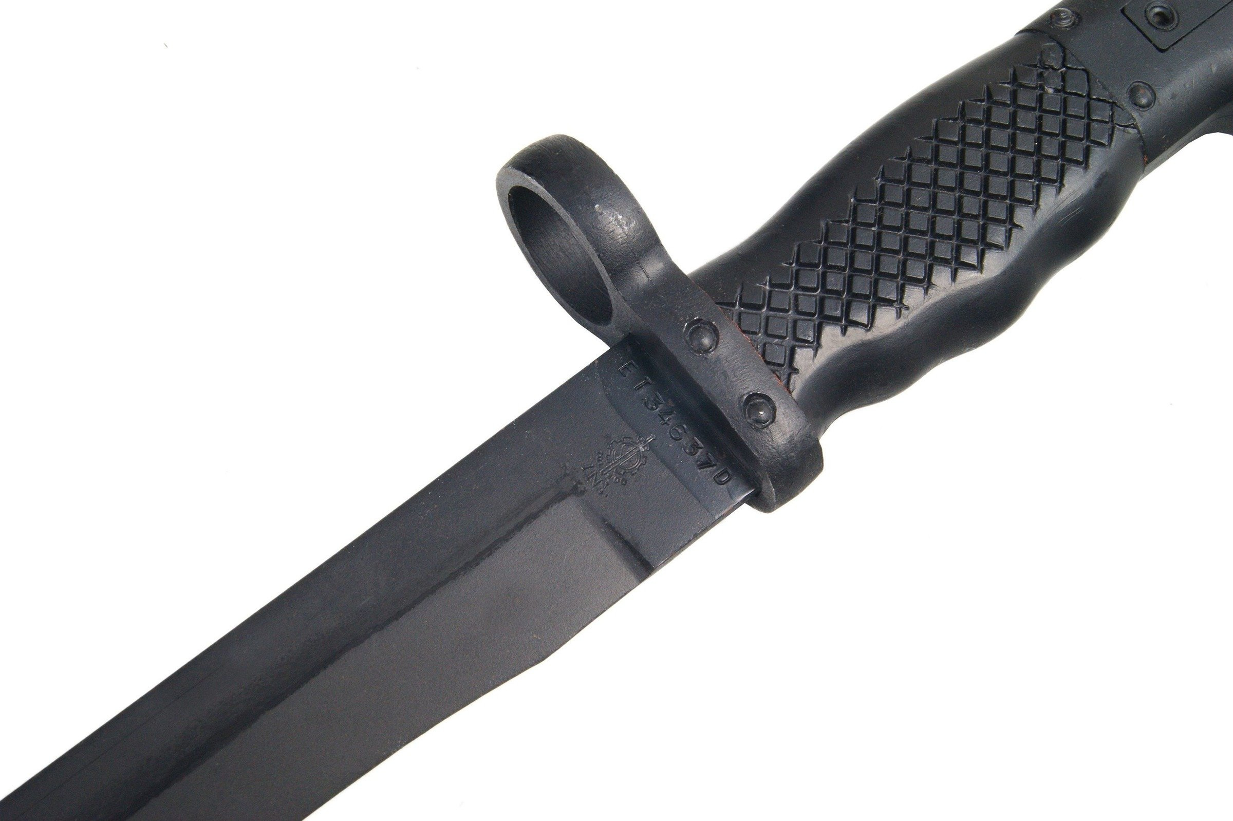 Oryginalny bagnet hiszpański do karabinu CETME, model określany jako M1964. Bagnety pochodzą z demobilu, posiadają ślady magazynowania. Stan zachowania - bardzo dobry. Zdjęcia przedstawiają przykładowe egzemplarze.