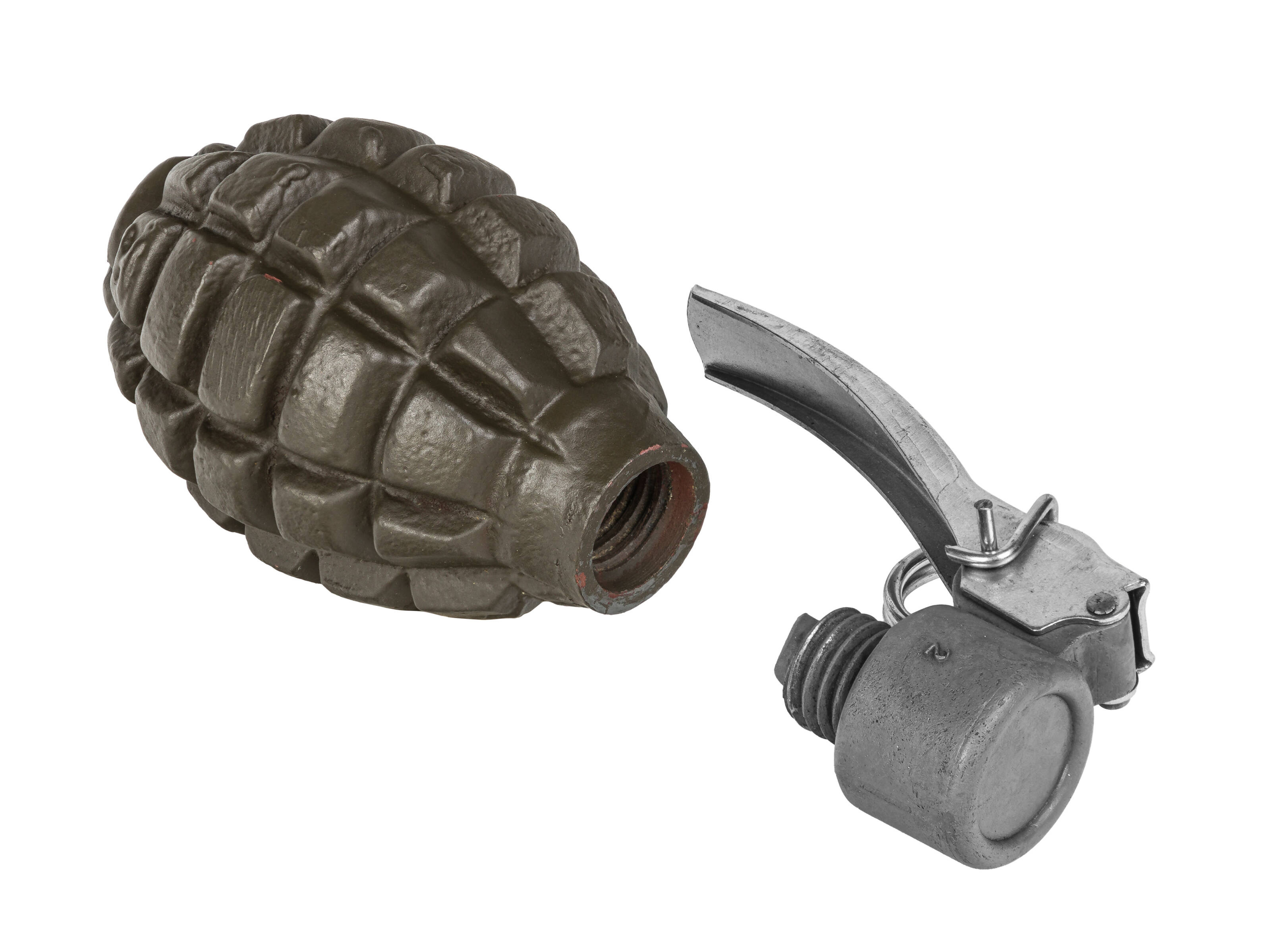 Doskonała replika polskiego granatu obronnego wz. 31 z zapalnikiem GR 31. Replika składa się z dwóch części: korpusu oraz wykręcanego zapalnika z zawleczką. Skorupa granatu wykonana z metalu. Replika zapalnika wykonana z metalu z sygnaturami. Granat pomalowany farbą w kolorze "polski khaki". Replika nie zawiera żadnych materiałów wybuchowych, jest tylko repliką dekoracyjną.
