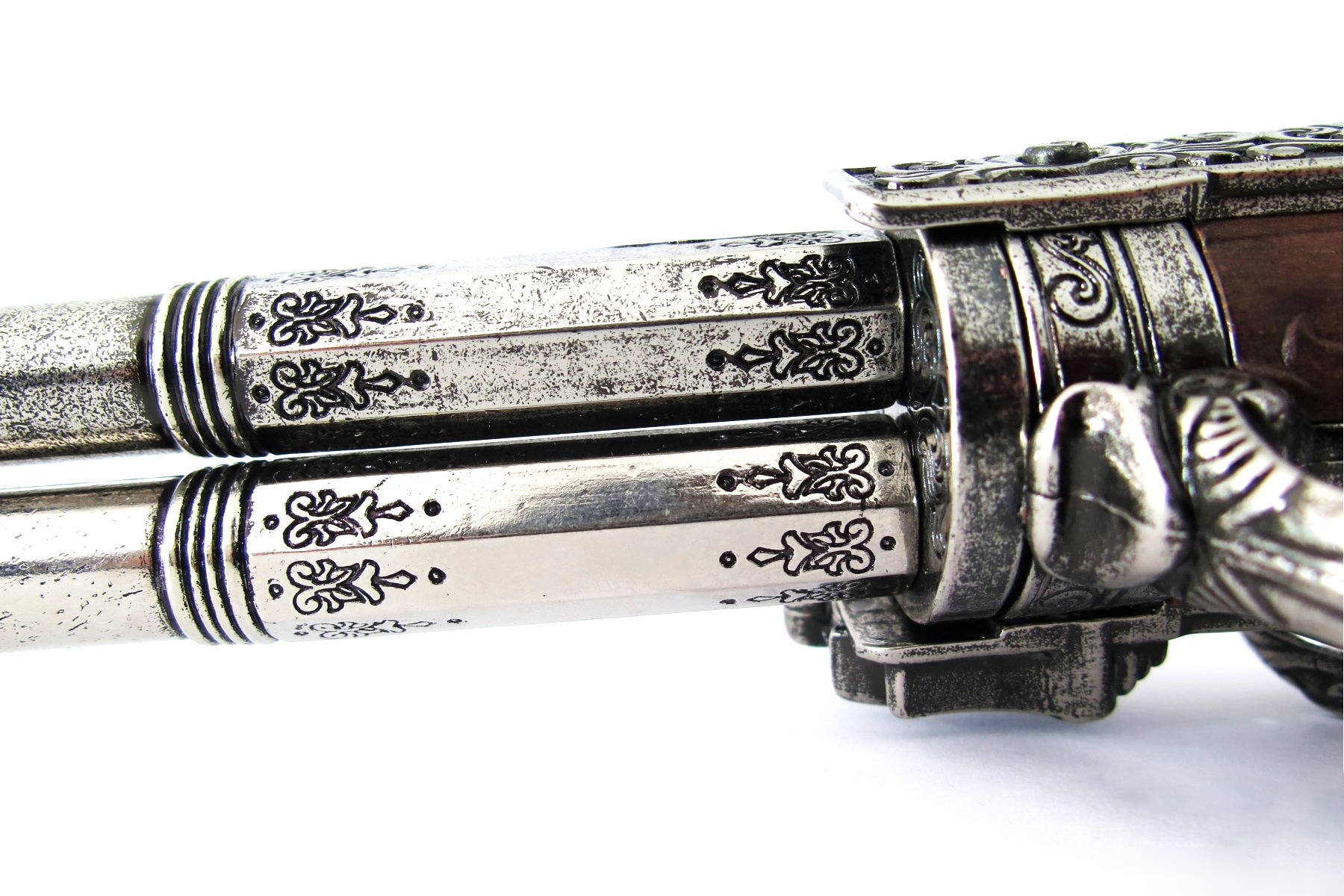 Doskonała replika francuskiego pistoletu dwu lufowego, renomowanej firmy Denix. Replika nie posiada żadnych istotnych części broni, nie jest możliwa również jej przeróbka na broń palną, zatem jest ona w pełni bezpieczna i legalna, nie wymaga też ani rejestracji, ani pozwolenia. Replika dwu lufowego francuskiego pistoletu z XVIII wieku. Prezentowana replika bardzo dokładnie odzwierciedla oryginał, wykonana z metalu oraz imitacji drewna. Metalowe wykończenia oraz lufa odlane ze zdobieniami charakterystycznymi dla epoki. Mechanizm wyposażony w ruchomy spust oraz kurek pozwala oddać suchy strzał.